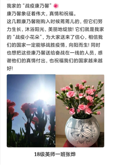 同时,还有一位让人印象深刻的作品是张烨同学的“战疫康乃馨”,康乃馨的花语是“热情”“魅力”,红色的康乃馨表达了作者对一线医护人员的崇拜与感恩,预示着他们为祖国建设的热情,一定会让我们的国家越来越好,向阳而生。两位同学最后以2866票和1306票获得了第一、第二的好成绩。