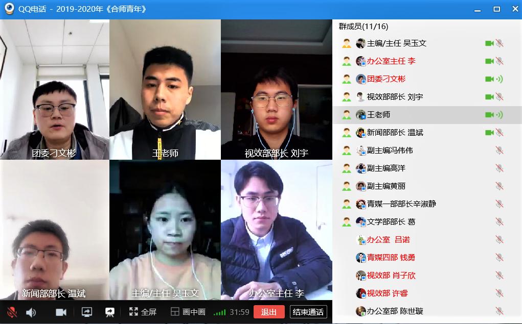 本网讯 3月16日中午,院团委学生组织《合师青年》编委会(青年新媒体中心)(以下并称“合师青年”)在线上召开2020年第一次全委会暨新学期工作部署会议。院团委副书记刁文彬,《合师青年》编委会全体记者、青年新媒体中心全体编辑参加会议。“合师青年”指导教师、院团委宣传思想部王露主持会议。