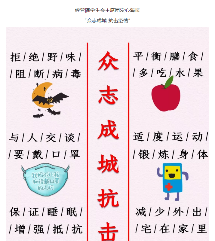 本网讯 “有一份热,发一份光,就令萤火一般,也可以在黑暗里发一点光,不必等候火炬”。在经济与管理学院党委的指导下,在学院团总支的号召下,近日,学院学生会开展“众志成城 齐心抗疫”爱心海报制作活动,各部门用一幅幅画卷助力疫情防控,以实际行动展现经管学子的担当和使命。(经济与管理学院)
