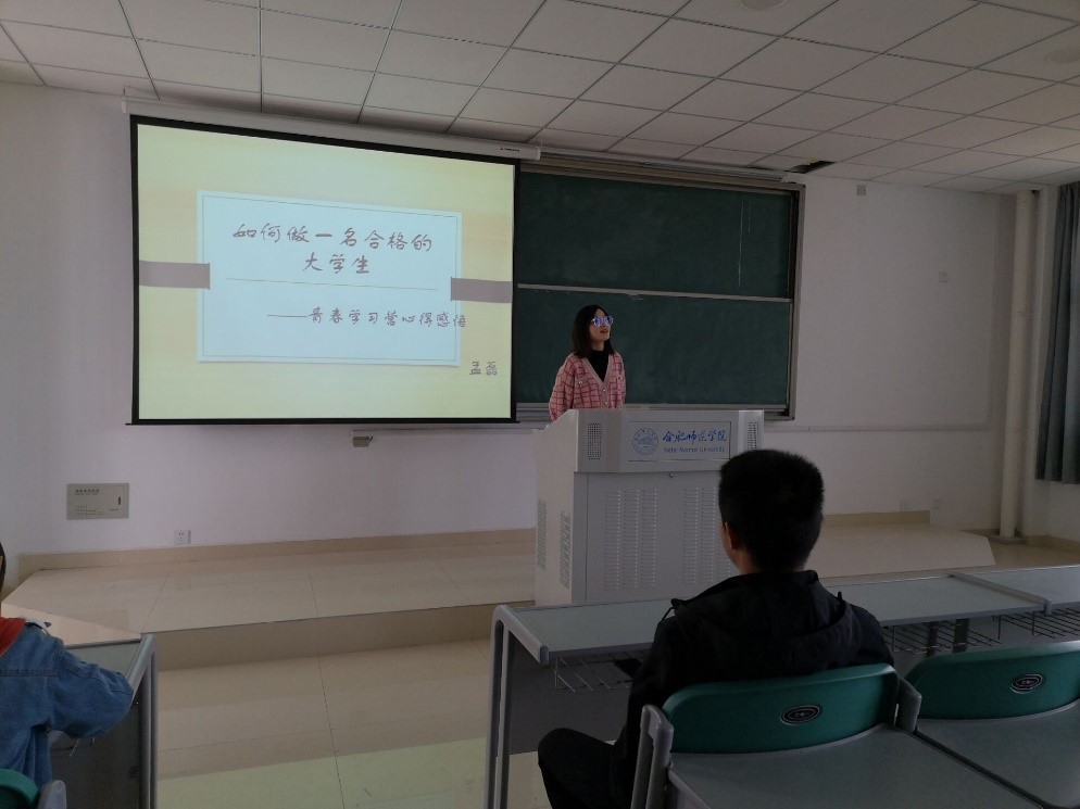 本次宣讲活动的主题是“如何做一名合格的大学生”。首先,2019级数学与应用数学专业的王咏琪同学带领新生们共同学习了《关于组织开展首届大学生“青春学习营”活动的通知》精神,让新生们对青春学习营有了初步认识,同时,向新生们介绍了孟磊学姐的学习和获奖情况。随后,孟磊向同学们讲述了自己参加青春学习营时发生的故事、学习到的知识、从中得到的收获与成长,调动新生们参加青春学习营的积极性。此外,作为学姐,孟磊向初入大学的新生们提出三点建议:一是希望同学们积极参加学院组织的活动,多锻炼自己;二是针对专业课的学习,同学们要注意上课认真听讲,课下及时完成作业,认真学习和总结专业课知识;三是要学会平衡学习与活动的时间安排,做事要严谨。孟磊提出的这三点建议,让新生们更加明白自身目前存在的问题并作了相应的调整。最后的答疑环节,孟磊为新生们解答了疑问。