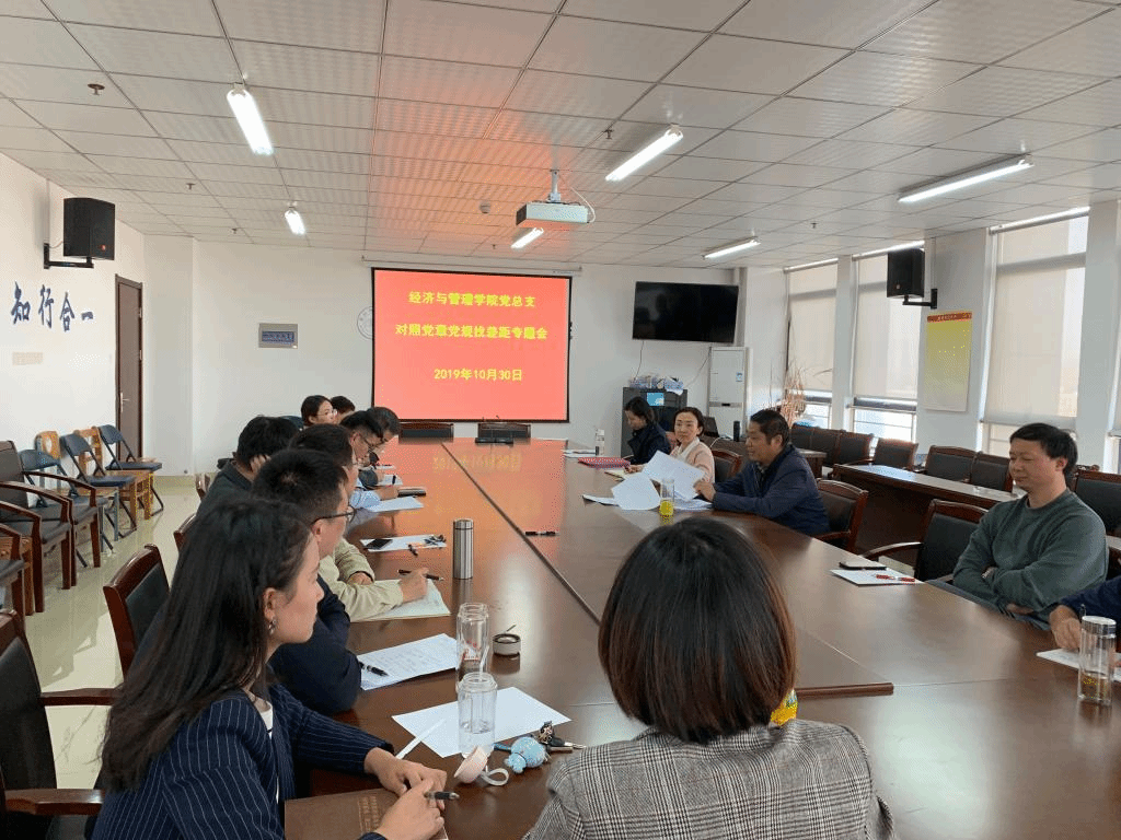 本网讯 根据我院《关于开展“不忘初心、牢记使命”主题教育实施方案》、《关于召开对照党章党规找差距专题会议的通知》的安排,10月30日中午,经济与管理学院党总支在行知楼902室召开对照党章党规找差距专题会议。结合学院自身实际,经济与管理学院处级党员领导干部在深入学习《中国共产党章程》、《关于新形势下党内政治生活的若干准则》、《中国共产党纪律处分条例》的基础上重点查摆“十八个是否”有无问题。