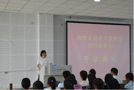 本网讯 9月23日中午,物理与材料工程学院在滨湖新区博学楼D101教室隆重举行2019级新生开学典礼。物理与材料工程学院党总支书记唐洁,副院长李大创,系主任李冬鹏、余龙宝、訾振发、王琳,教师代表吕建国,辅导员吴梦云、韩翔,党政秘书李浩,学生代表孙锡妹以及2019级全体新生参加典礼。典礼由党总支副书记吴震主持。
