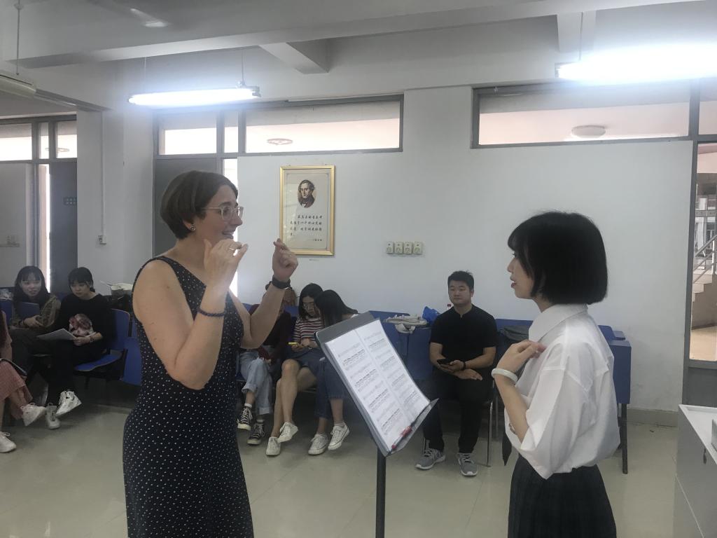 短暂的师生见面会之后,德国教师与我院学生开始了教学活动,德国教授Eva Herzig与我院声乐系学生在音乐楼理论教室进行教学,教学分上午独唱作品,下午重唱作品两部分,我院部分师生旁听。