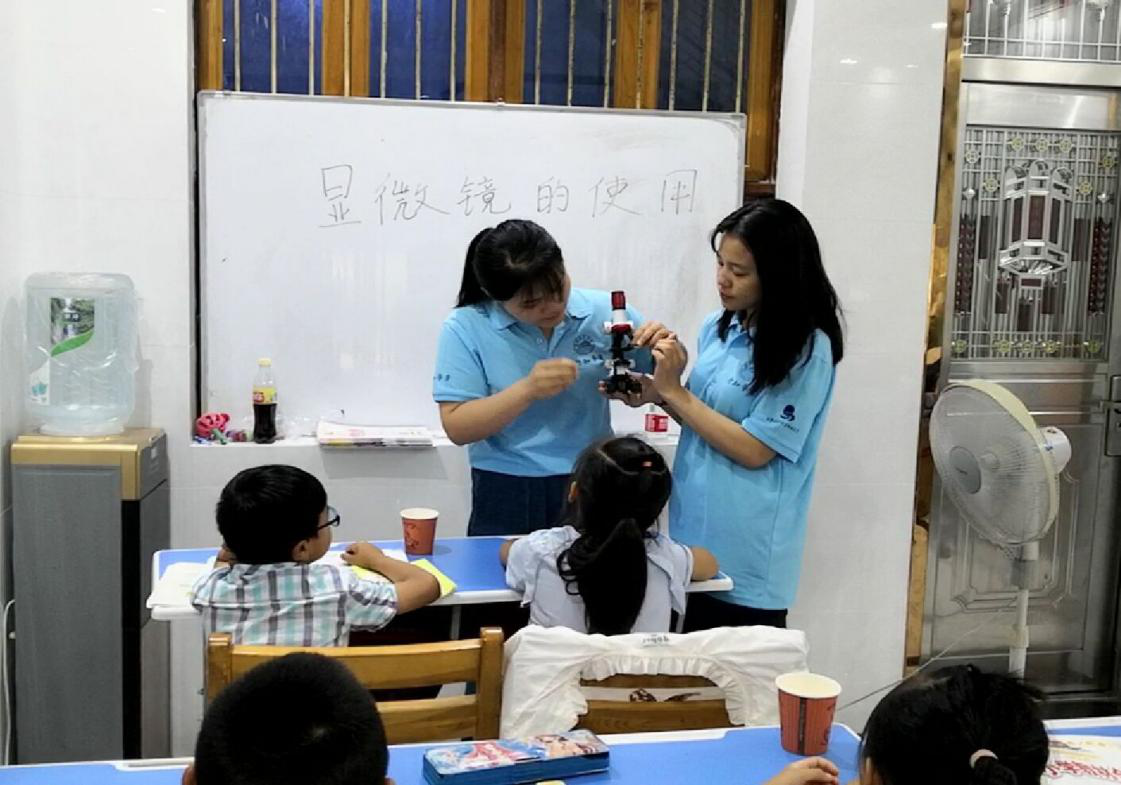 小先生张静和肖鸿芸首先向小朋友们介绍了显微镜的使用价值,告诉小朋友显微镜可以更好地向我们展现出微观世界,让小朋友们了解宏观世界是由微观结构组成的。他们还仔细地介绍了显微镜的使用方法,同时使用实验材料进行了示范。