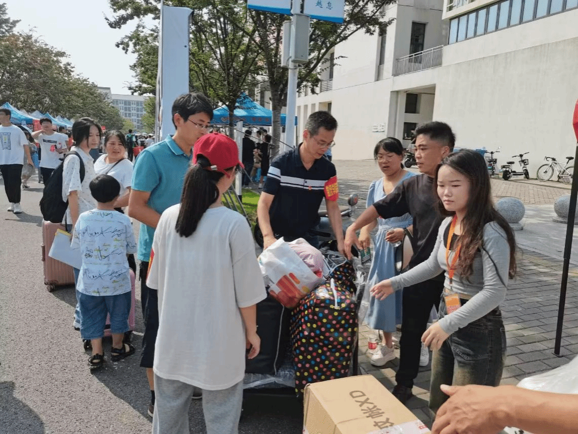 学院党委书记穆娟、副书记陶金昌、副院长黄浩、党员教师吴兴杰、潘根安、王燕,他们佩戴着学院标识,与学生迎新志愿者们一起热情地与新生及其家长交流,耐心解答报到流程及咨询的问题,引导新生进行宿舍安排、注册报到,并向新生发放校园卡、安全温馨提示。他们为了帮助新生高效有序地完成入学流程,志愿者们还穿梭在人群中,帮忙搬运行李,将学生们一一送到宿舍,使2023级新生及家长们充分感受到了“数学与统计学院”这个“大家庭”的温暖。