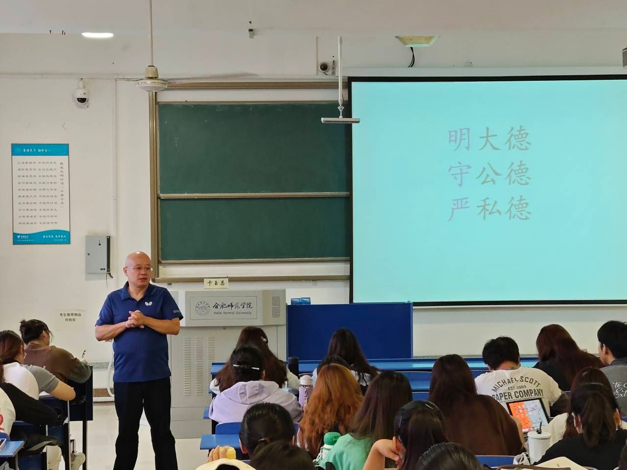 本网讯 为进一步加强师范生师德教育和实习工作,9月21日上午,教育与心理科学学院在锦绣校区逸夫楼A201教室开展师德教育活动。学院邀请合肥市屯溪路小学书记、校长卞玉昌以《从文化属性探究师德的现实意义》为主题进行了师德教育指导。教育与心理科学学院2021级小学教育专业全体学生参加了活动,活动由教育与心理科学学院副院长闫龙主持。