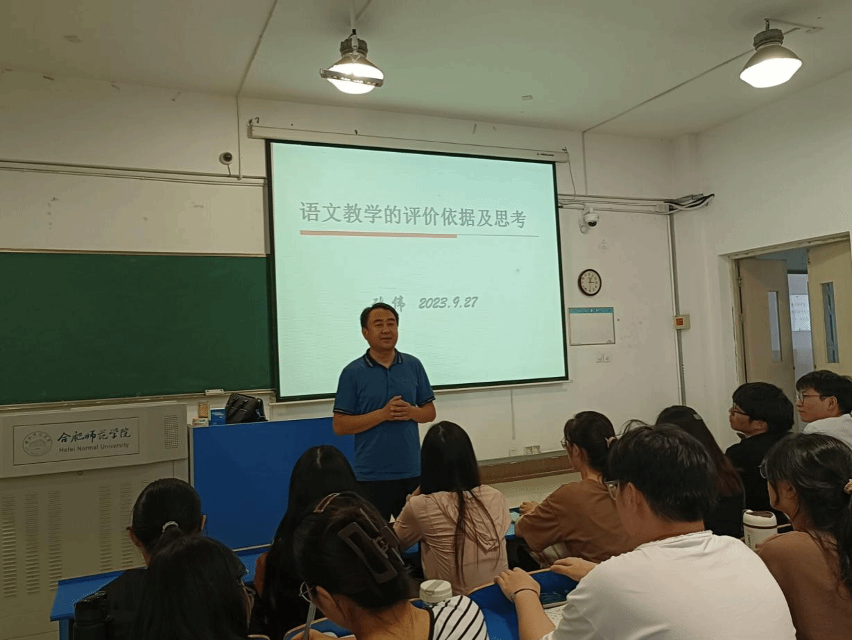 本网讯 9月27日下午,文学院开展“基础教育名师进课堂”活动,邀请合肥市第四十八中学教育集团滨湖校区校长、硕士生校外导师张伟走进汉语言文学专业课堂,并作了题为“语文教学的评价依据及思考”的报告。文学院2021级汉语言文学专业学生、部分教师聆听了报告。报告由文学院副院长甘松主持。
