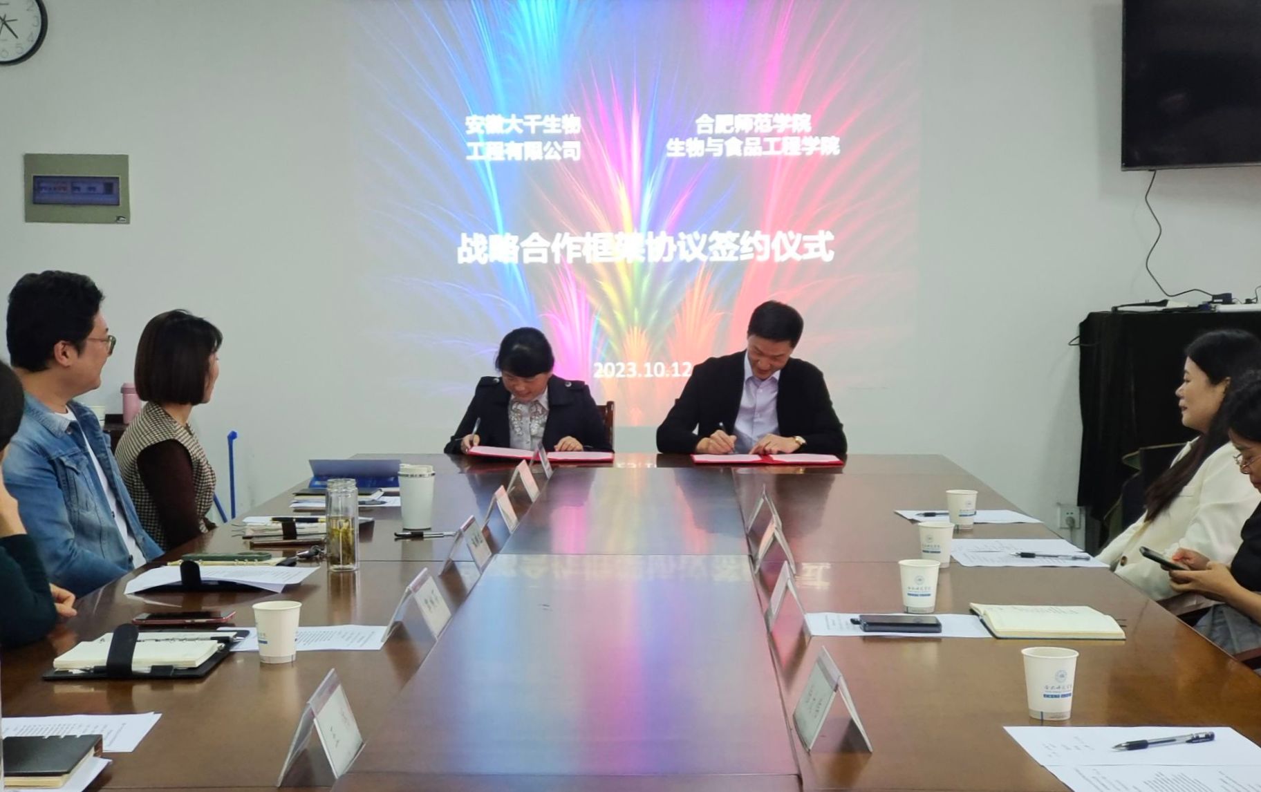 10月12日下午,生物与食品工程学院与安徽大千生物工程有限公司举行了战略合作签约仪式。安徽大千生物有限公司董事长芮双印、总经理李燕华、总工程师陆大伟、人事经理边晓红,生物与食品工程学院党委书记郭桃芬、副院长朱桂兰、党委副书记马喆、副院长王伟和相关教师参加签约仪式,会议由副院长朱桂兰主持。