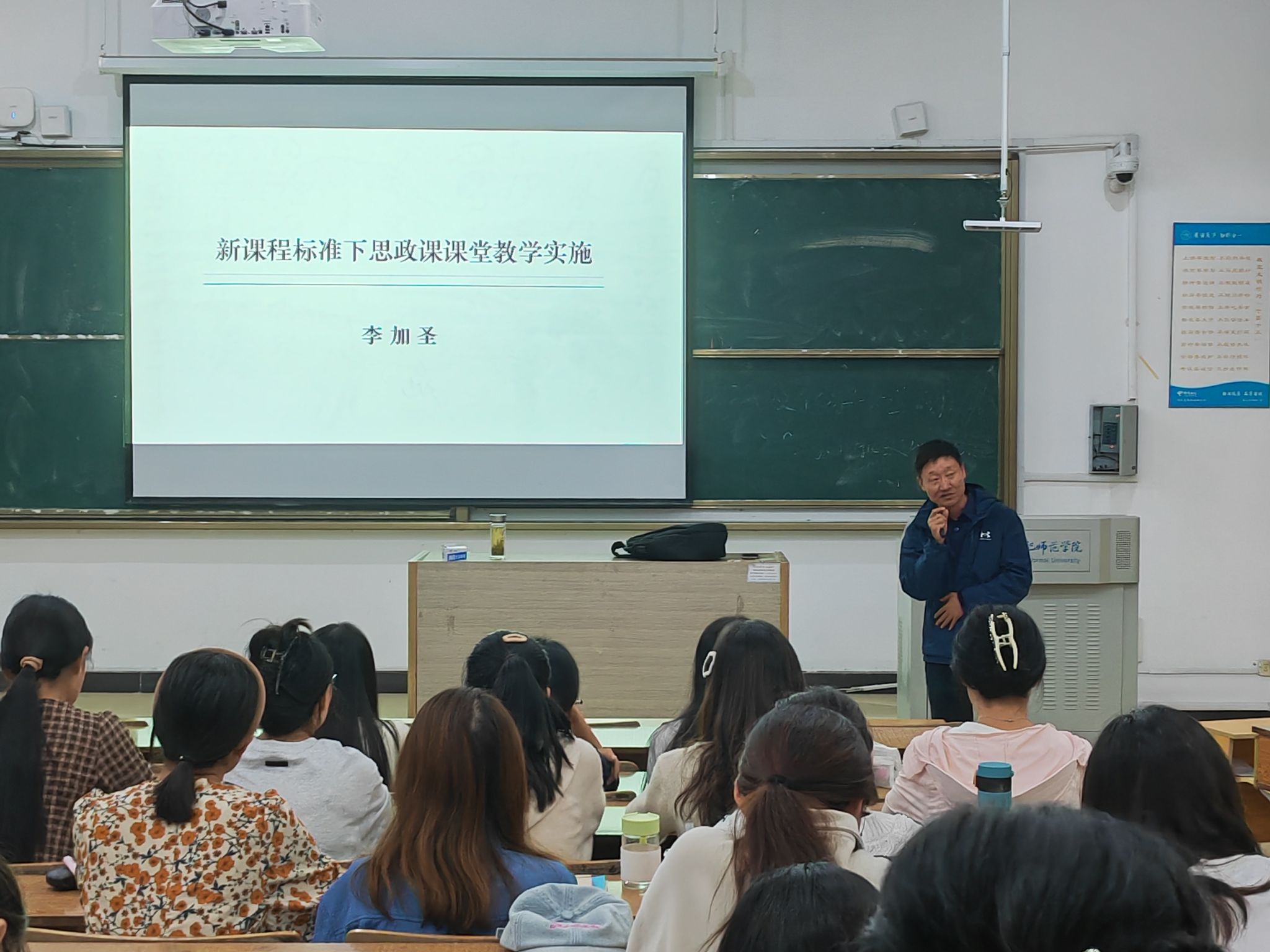 本次讲座,李加圣围绕“新课程标准下思政课课堂教学实施”主题,从“聚焦道德与法治课程标准(2022年版)”“关于道德与法治课程设计的常见问题”两个方面入手,聚焦义务教育道德与法治新课程实施以来教学实践中的五大热点问题——核心素养目标的撰写、服务教学的情境设计与优化、课堂设问的精准性、指向深度学习的“教学评”一致性、课堂教学实践中的学科融合方面,运用典型教学案例,事例结合,事理结合,动静结合,启发引导我院学生如何将新课程理念贯彻落实到教学实践中。学生听后深感专业学习思路更加开阔了,2022级学科教学(思政)班黄蔓玲表示“我听后,开始知道如何撰写核心素养教学目标了”;2022级思政班学委王远表示“李老师的讲座,让我们对2022年版课标有了新的了解,李老师通过对立德树人、创新导向和深度学习的教学设计和实施的解读,让我们明确了在以后的教学中要清楚教师教什么 、学生学什么和学到什么程度等,我们受益匪浅”;2022级思政班许诺同学表示“李主任聚焦2022年版道德与法治课程标准,通过典型课例《坚持国家利益至上——我爱这土地》,生动形象地展示了课堂教学实践中的学科融合,听完讲座,我不仅开拓了知识视野,而且锻炼和提升了作为师范生的反思和研究能力,受益颇多”;2023级学科教学(思政)班公冶繁荣表示“听完李主任的讲座,我醍醐灌顶。李主任运用丰富且典型的教学事例,引导我们思考和践行如何将新课程理念落实到教学实践之中,我感受要积极研读新课程标准,仔细品味思考核心素养落实的着力点,突出学生中心,全面锻炼和提高自己的教学本领,努力在未来的思政课岗位上熠熠生辉”。