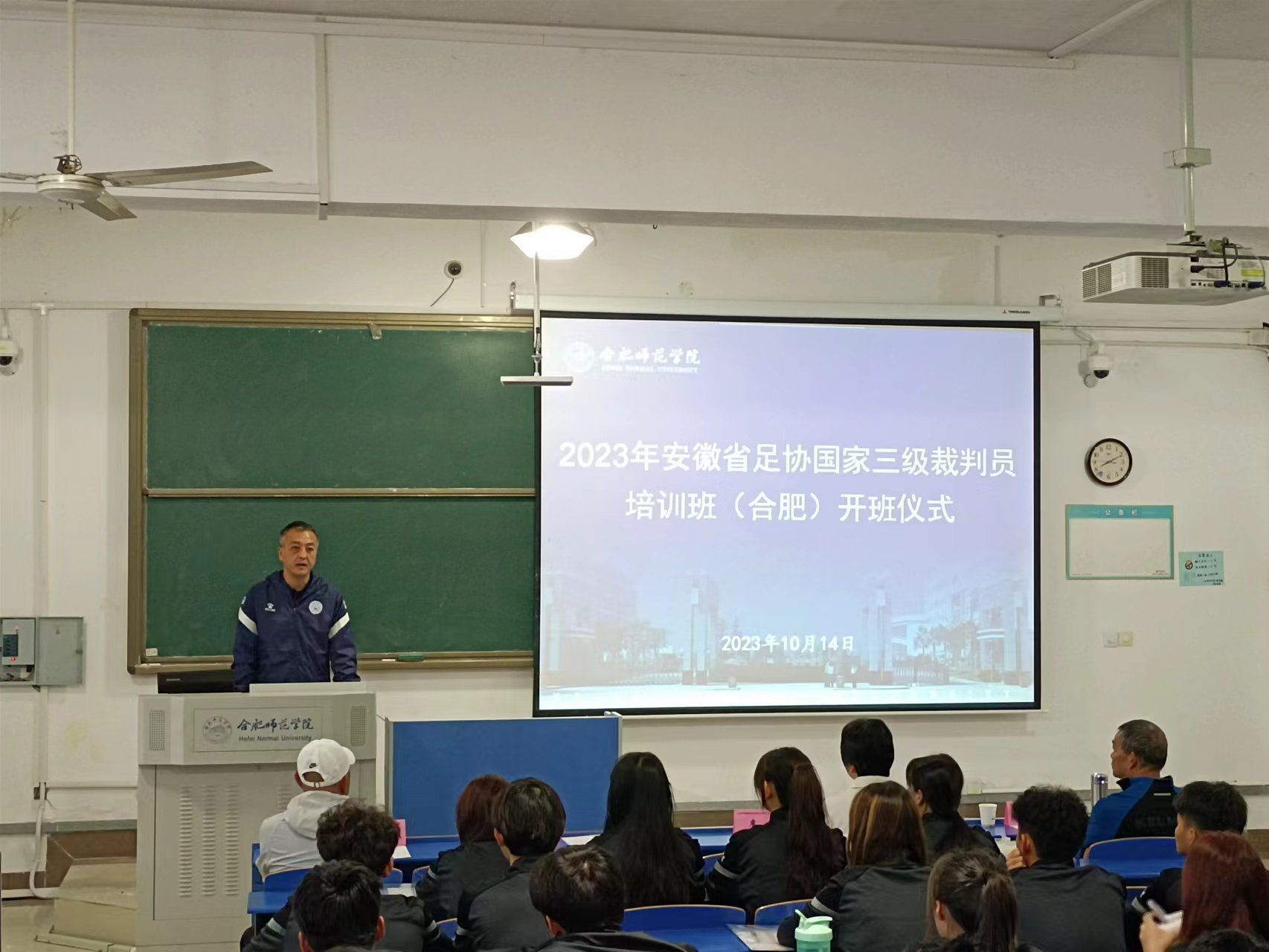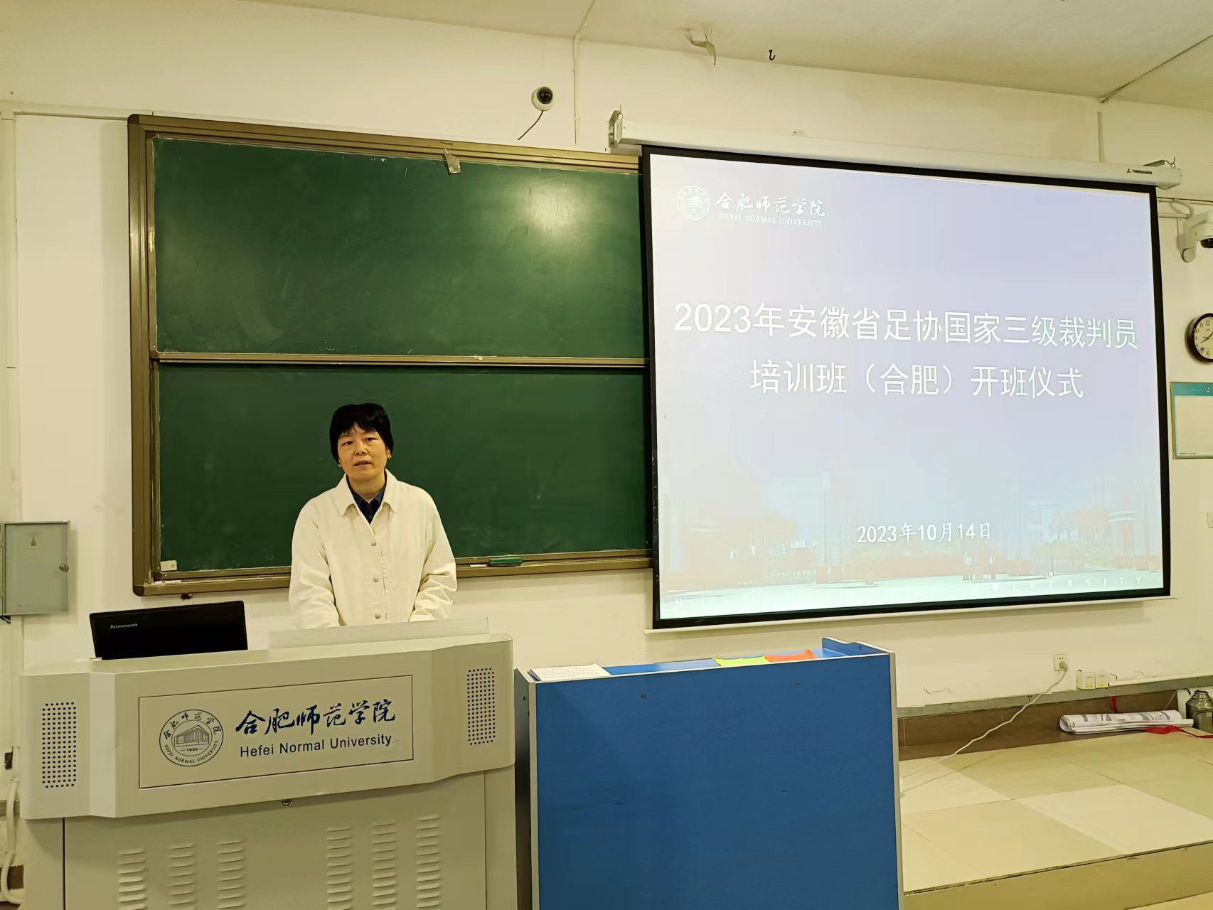 10月14日上午,培训班开班仪式在学院锦绣校区举行。beat365唯一官方网站体育科学学院副院长席莉,合肥市足协常务副主席、秘书长王欣,合肥市足协副秘书长、裁委会主任谢长征,合肥市足协裁委会副主任、本次培训安徽省足协指定讲师邵安强,合肥市足协副秘书长黄忠芬,合肥市足协裁委会副主任李明,合肥市足协裁委会委员陈亚洲,以及全体参训学员参加。