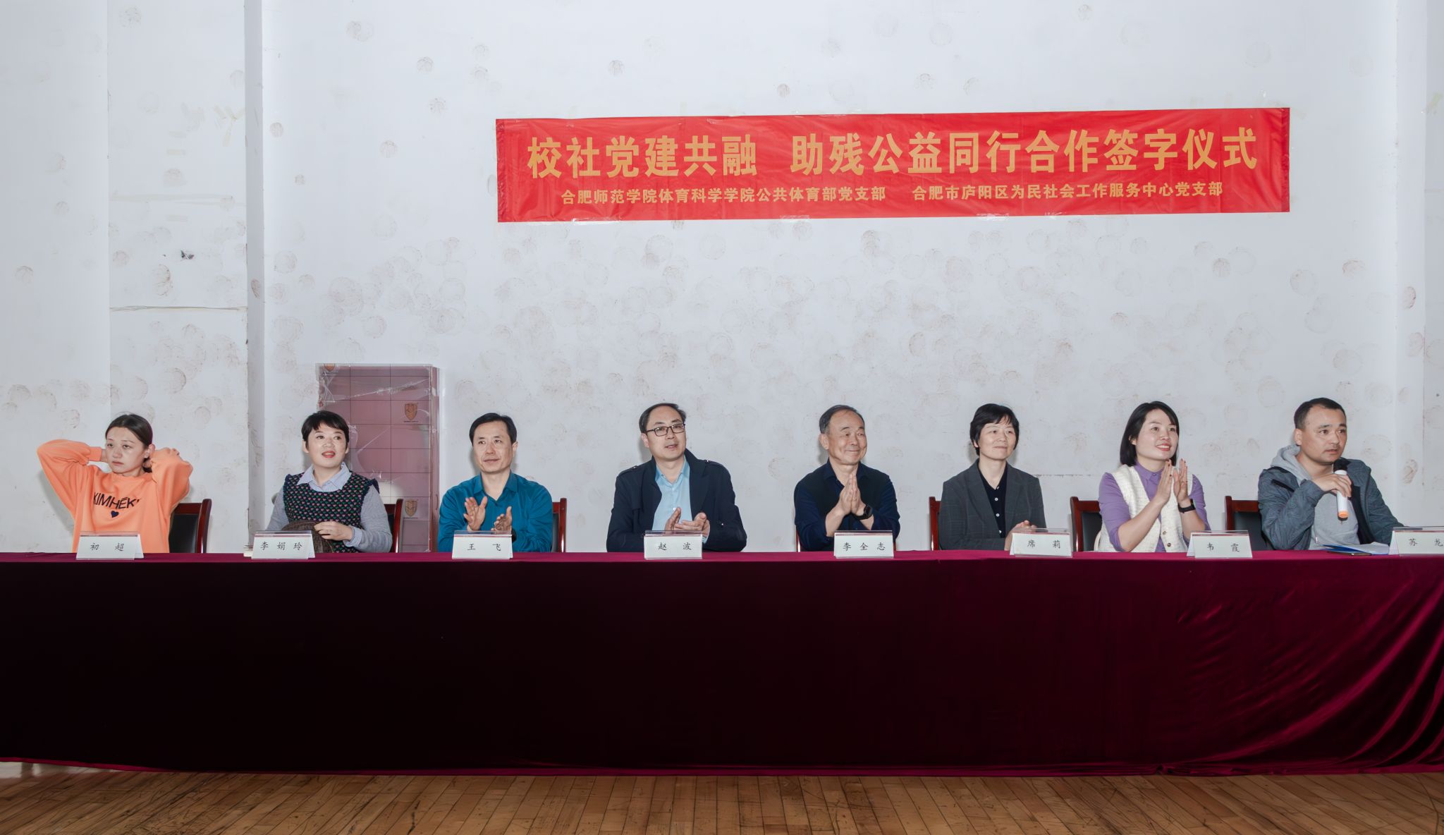 播下一粒种子,收获一片生机;献出一颗爱心,托起一份希望。10月25日下午,体育科学学院公共体育部党支部和合肥市庐阳区为民社会工作服务中心党支部“校社党建共融 助残公益同行”公益活动暨合作签约揭牌仪式在学校锦绣校区体育馆举行。体育科学学院党委书记赵波、党委副书记王飞、副院长席莉出席,合肥市庐阳区为民社会工作服务中心党支部书记李全志、中心老师和孩子们及部分家长代表,公共体育部党支部全体教师党员及各系部师生代表近百人参加。仪式由公共体育部党支部组织委员苏龙主持。