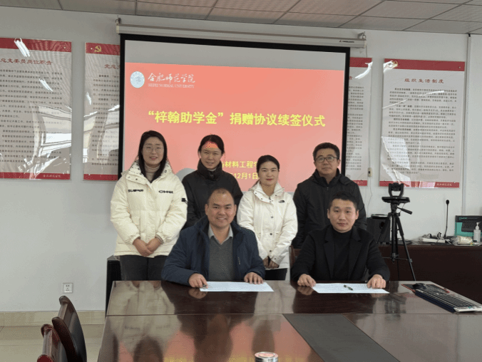 12月1日,“梓翰助学金”捐赠续签仪式在锦绣校区行知楼1202会议室举行。安徽梓翰工程信息技术有限公司董事长胡毅、副总经理郑贤萍,物理与材料工程学院党委书记吴长龙、物理与材料工程学院党委副书记吴震,以及物理与材料工程学院部分师生代表出席了本次活动。
