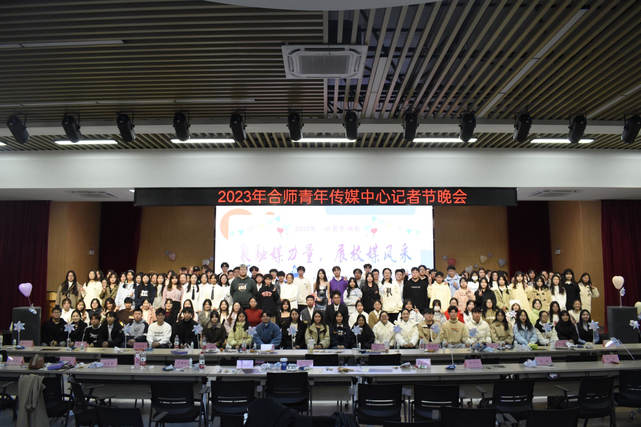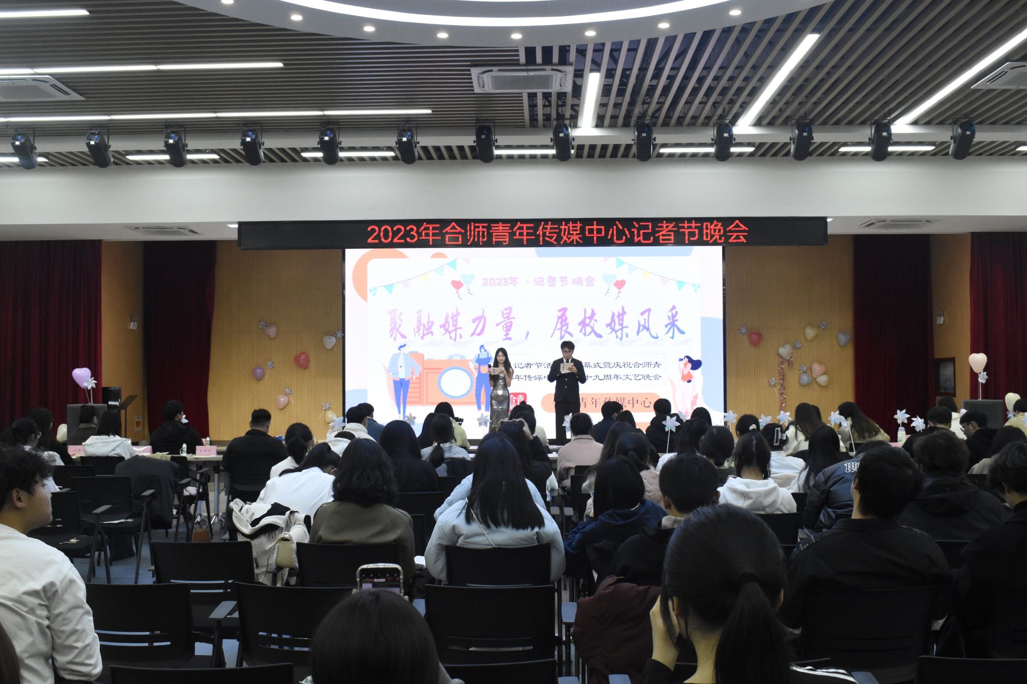 12月3日下午,由院团委主办,合师青年传媒中心承办的2023年记者节活动月闭幕式暨庆祝合师青年传媒中心成立十九周年文艺晚会在锦绣校区大学生活动中心顺利举行。合师传媒中心全体成员,校学生会、学生社团文化服务中心、青年志愿者联合会、“第二课堂”学分认证中心、校新闻中心记者团、广播台、大学生自律委员会成员代表到场观看晚会。