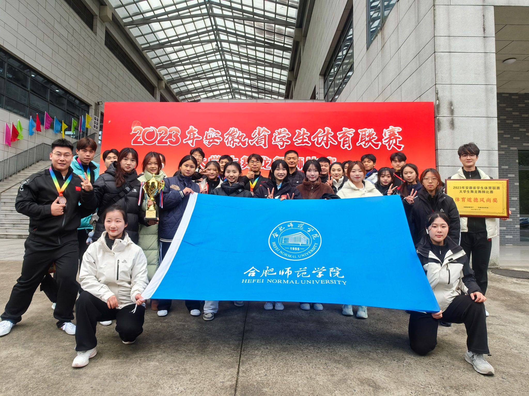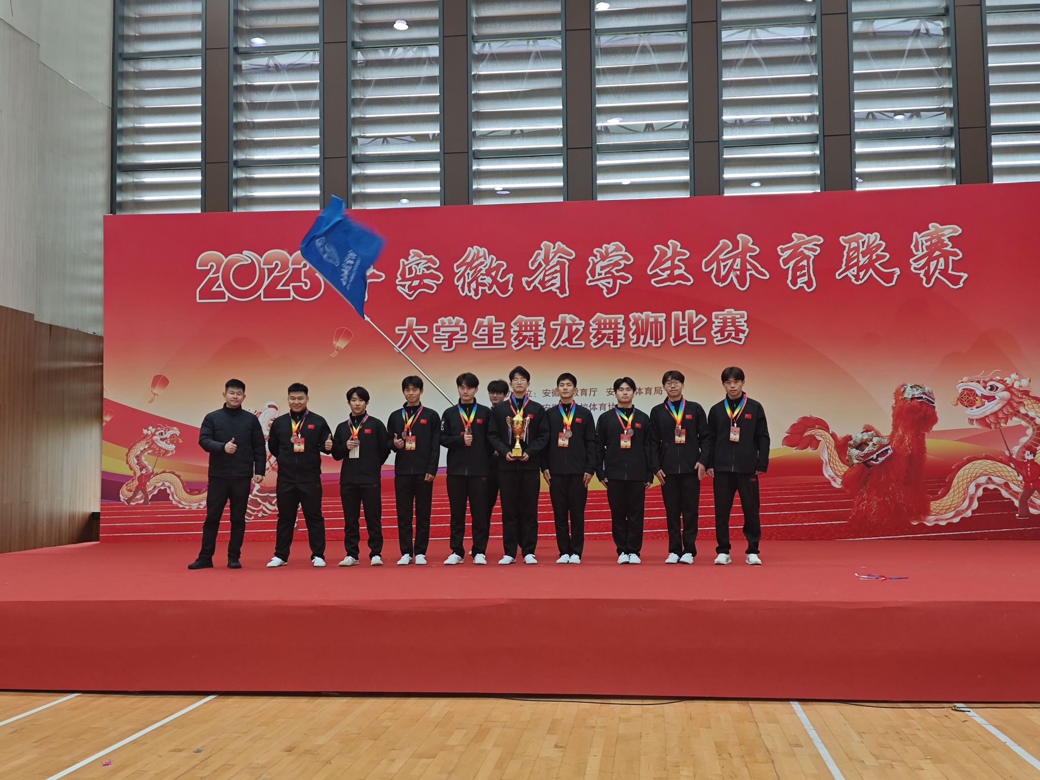 12月9日-12日,由安徽省教育厅、安徽省体育局主办,黄山学院承办的2023年安徽省学生体育联赛大学生舞龙舞狮比赛在黄山学院体育馆举行。我院舞龙舞狮队共25名队员参加了女子丙组竞速龙、女子丙组舞龙规定套路和丙组彩带龙自选套路三个项目,比赛中,队员们团结协作、敢于拼搏,获得了女子丙组竞速龙第三名、女子丙组舞龙规定套路第四名和丙组彩带龙自选套路第三名的好成绩,同时获得“体育道德风尚奖”,倪莹、雷梓嫣获得体育道德风尚奖运动员。