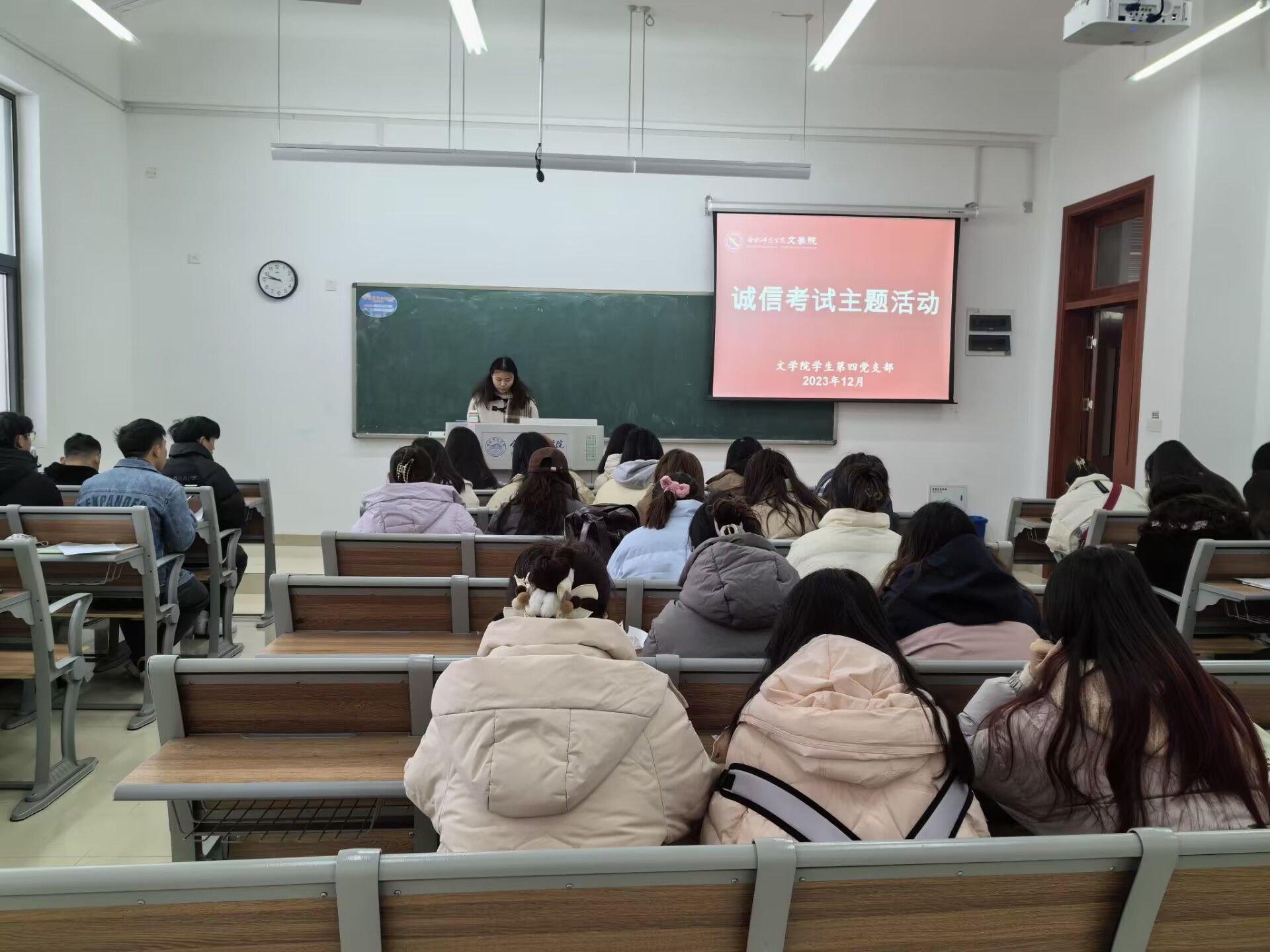 为进一步加强学风建设,端正考风,严肃考纪,营造文明有序的校园考试环境,发挥学生党员的带头示范作用,近期,文学院各学生党支部陆续开展以“诚信考试、党员先行”主题的党日活动。
