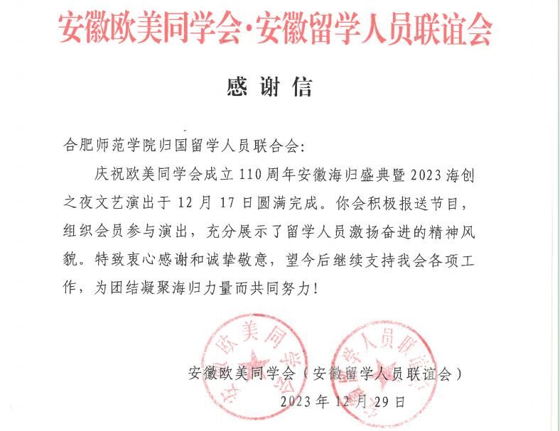 近日,安徽欧美同学会、安徽留学人员联谊会致函感谢我校侨留联,对我校侨留联积极报送节目、组织会员参与庆祝欧美同学会成立110周年安徽海归盛典暨2023海创之夜文艺演出表示衷心感谢和诚挚敬意。