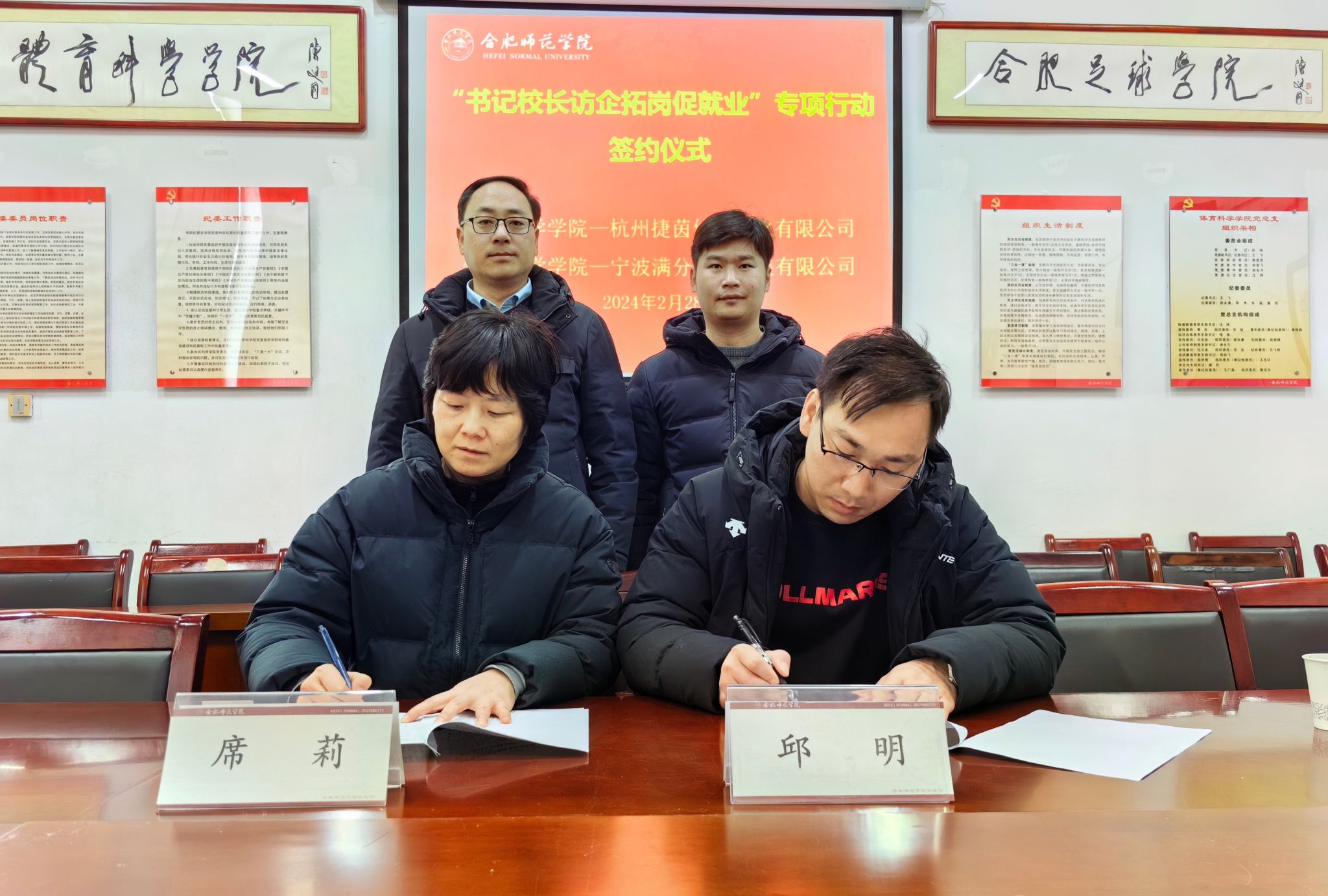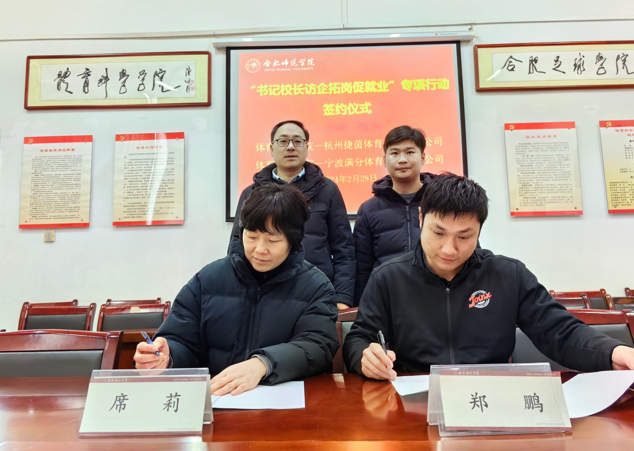 为进一步开拓毕业生就业岗位,畅通人才供需信息渠道,加强校企合作,2月28日,体育科学学院邀请杭州捷茵体育文化有限公司、宁波满分体育发展有限公司、安徽鑫空体育文化传播有限公司、安徽合思达体育俱乐部有限公司、合肥梧山足球培训学校有限公司、合肥共创商贸有限公司等6家企业来校参加专场招聘会。招聘会期间,学院开展了“访企拓岗促就业”用人单位座谈会并签订毕业生就业实习基地协议,学院领导班子、毕业班辅导员参加座谈会。