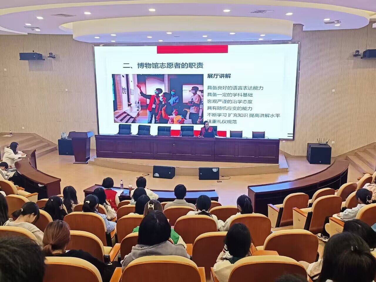 宣讲会上,安徽博物院龙静从博物馆志愿者定位、职责、责任及收获等方面介绍了志愿者的使命和担当;刘绮格为同学们详细介绍了安徽博物馆里的国宝级文物。刘恒从服务内容、服务形式、管理形式等方面介绍了志愿服务队建设的愿景。并与同学们积极互动交流,现场气氛热烈非常。