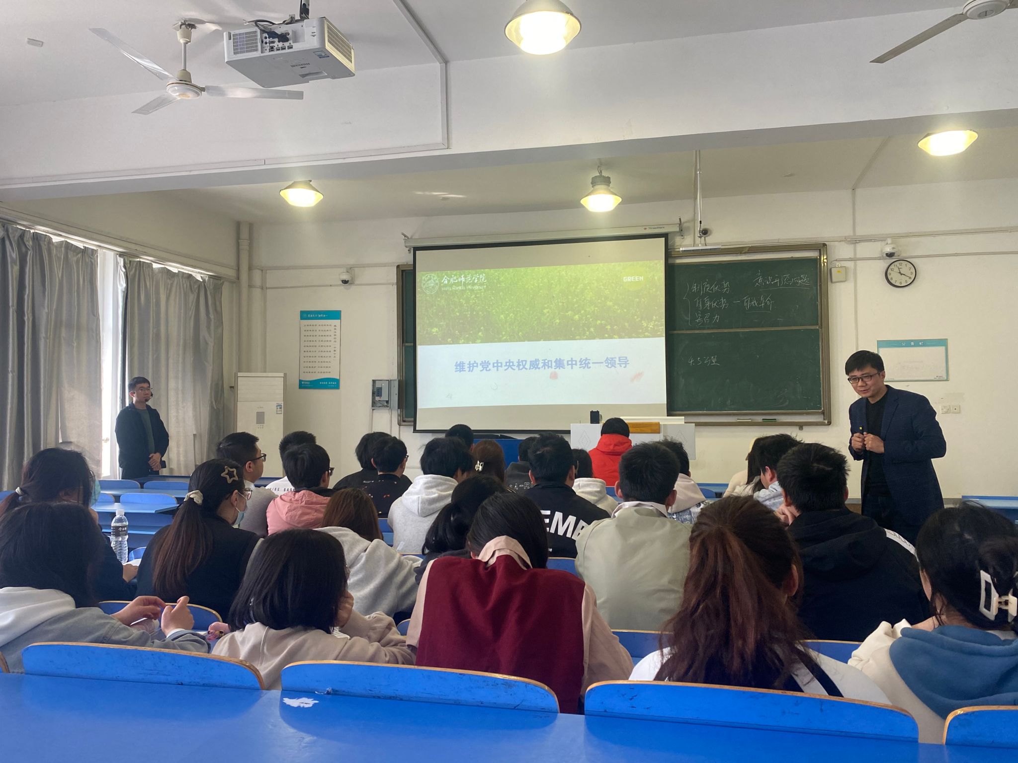 在逸夫楼A407教室,郝嘉乐用“请你谈谈,人民群众支持与拥护中国共产党的事例”导入,运用大量鲜活的学生身边事例、典型案例、红色故事,生动阐释“坚持党对一切工作的领导”重大意义,深入分析“党的领导是全面的、系统的、整体的”。紧接着,张军占又从理论、历史、现实三重逻辑全面分析“维护党中央权威和集中统一领导”是历史和人民的选择,是提高国家治理科学决策的最有效原则。同时引导青年大学生爱党爱国,自觉地拥护“两个确立”、做到“两个维护”。