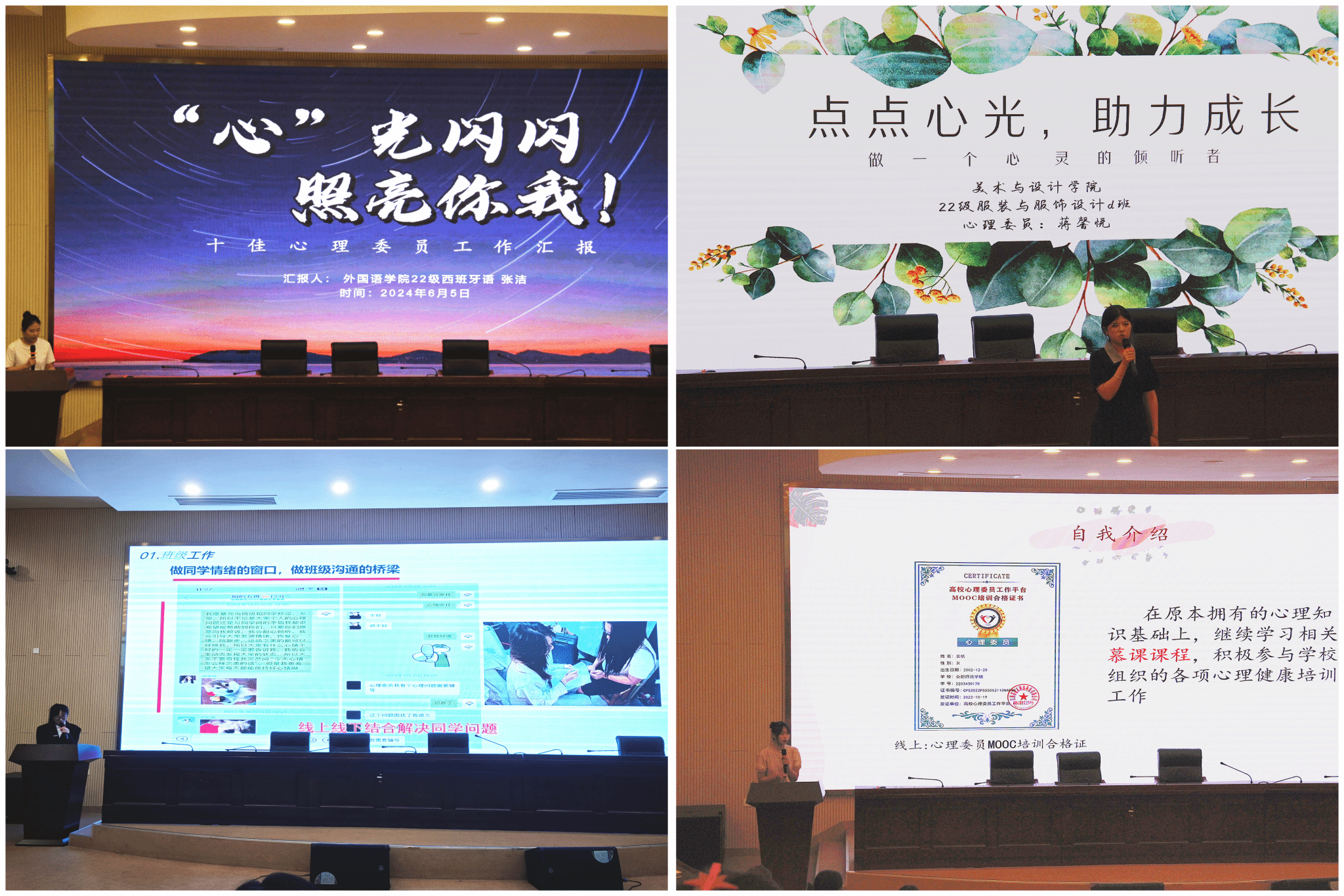 经评委评分,外国语学院张洁、物理与材料工程学院唐悦、文学院刘笑薇、教育与心理科学学院裴帆、经济与管理学院水梦婷、音乐学院葛文静、化学与制药工程学院马欣月、电子信息与集成电路学院王仁雯、马克思主义学院何莞竹、生物与食品工程学院曹苒然10名同学被评选为第五届“十佳心理委员”。