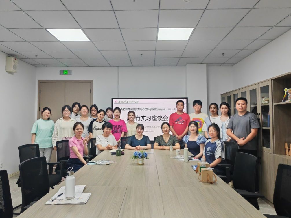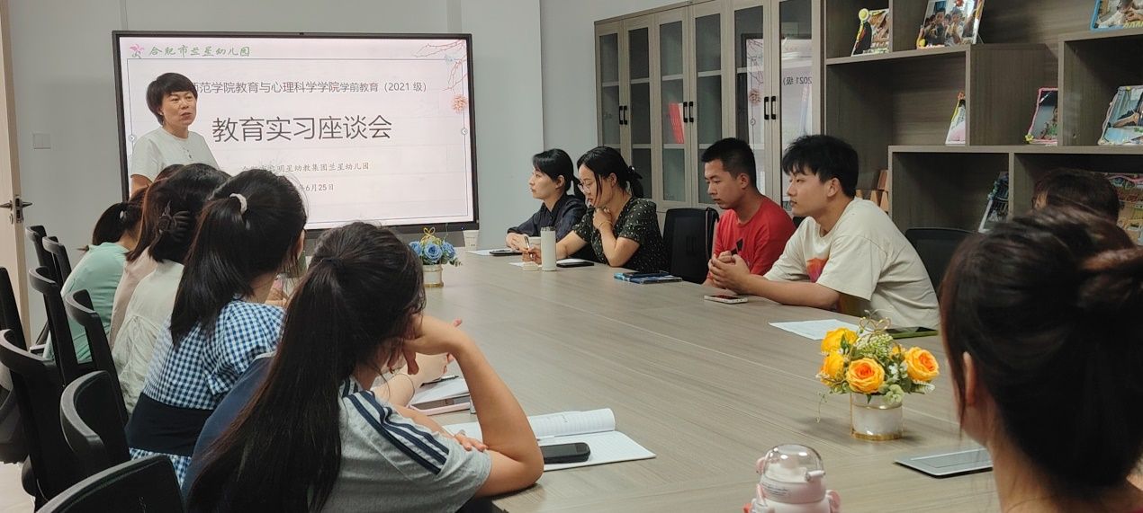为巩固与检验学生教育实习(研习)效果,强化学生实践感悟,6月25日下午,教育与心理科学学院学前教育系与合肥市兰星幼儿园实习点联合召开实习总结座谈会,会议在兰星幼儿园会议室召开,兰星幼儿园园长王小婵、教学主任孙红,教育与心理科学学院教师蒋晨晓、张华玲以及2021级学前教育专业兰星实习点全体学生参加座谈活动。