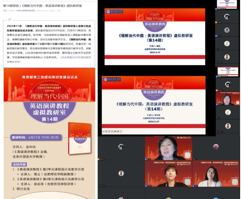 6 月 27 日晚,教育部第三批虚拟教研室——《理解当代中国:英语演讲教程》虚拟教研室第14期教研活动成功举办。本次教研活动由《理解当代中国:英语演讲教程》主编,北京外国语大学教授金利民主持,外国语学院强云、谈谷雨两位老师受邀分别基于第3单元和第4单元的课程设计和教学示范做了汇报分享。本次活动旨在深入探讨如何依托《理解当代中国:英语演讲教程》教材优化英语教学,更好地助力新时代兼具家国情怀和国际视野的高素质国际化外语人才的培养。