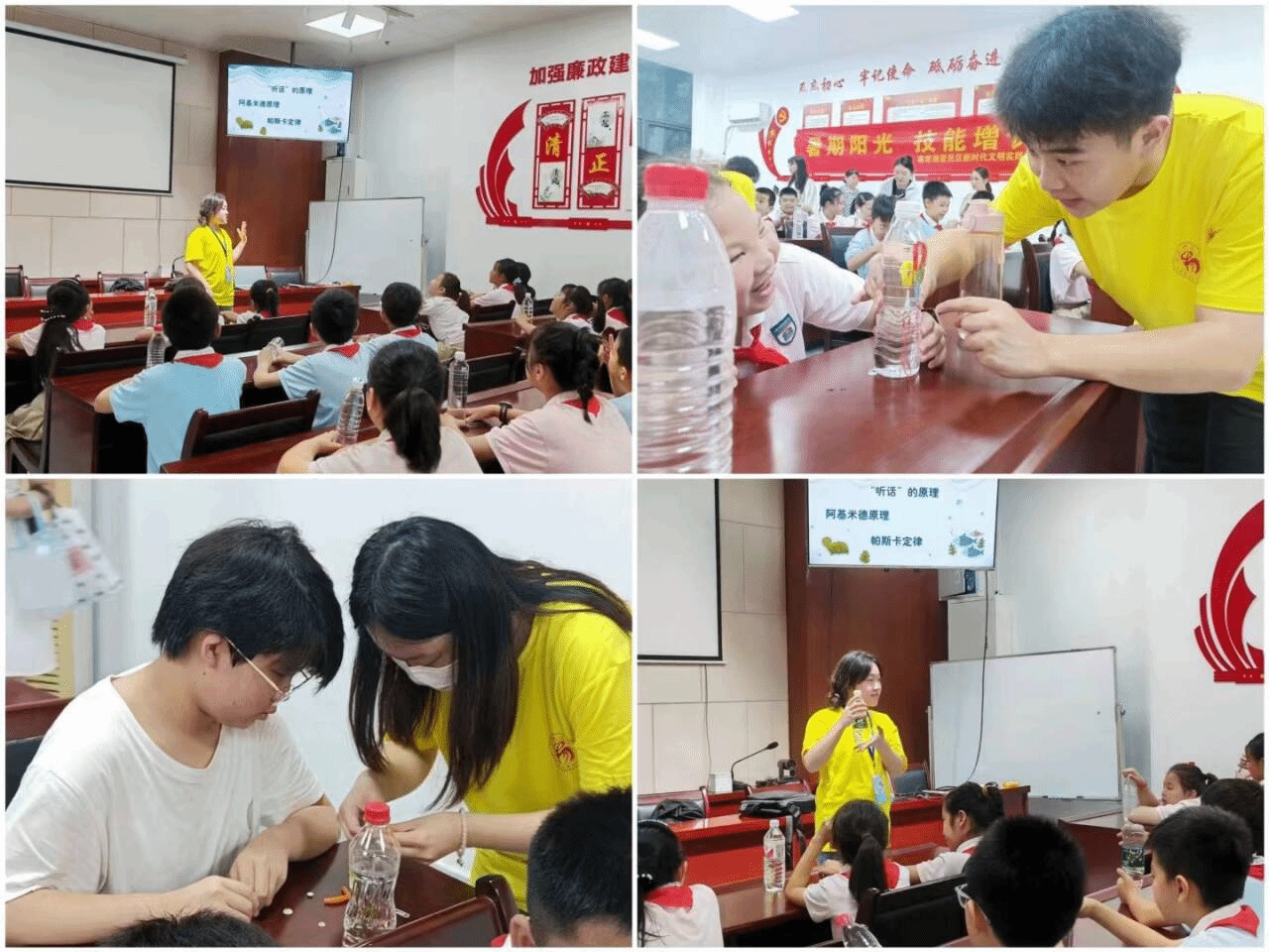 本次活动围绕“听话的小章鱼”实验,向小学员及其家长们展现了科学魅力,从而锻炼小学员们的动手能力和动脑能力。科普服务队队员邢可爱带领小学员们亲自动手体验,通过将穿好回形针的“小章鱼”放入矿泉水瓶中,然后用力挤压瓶子来观察瓶子中“小章鱼”的沉与浮。趣味十足的实验赢得了小学员和家长们的掌声和赞赏。随后,队员们为小学员解释了趣味实验背后的原理—帕斯卡定律,小学员们认真听讲,努力思考,积极互动,现场氛围浓厚。