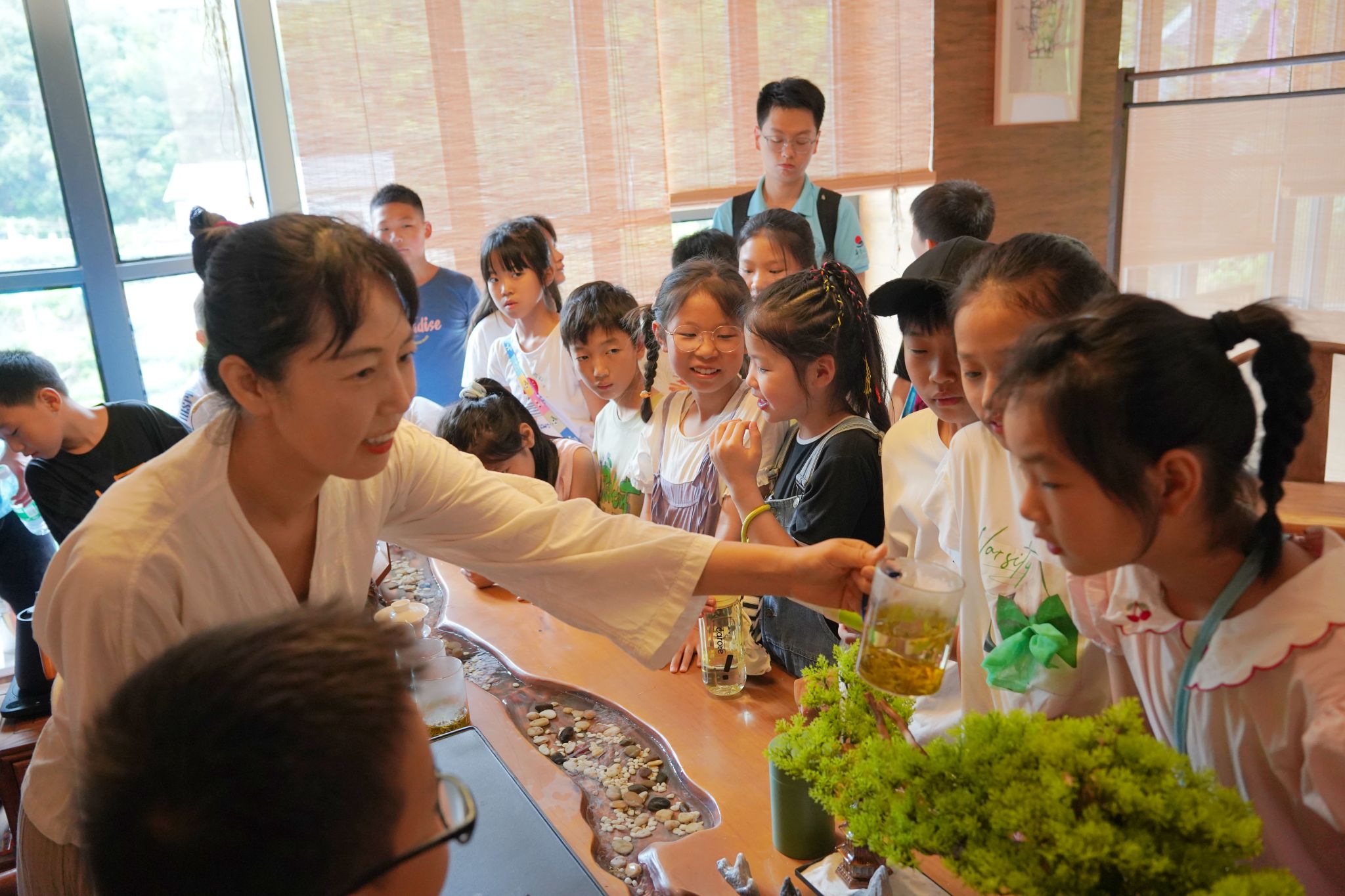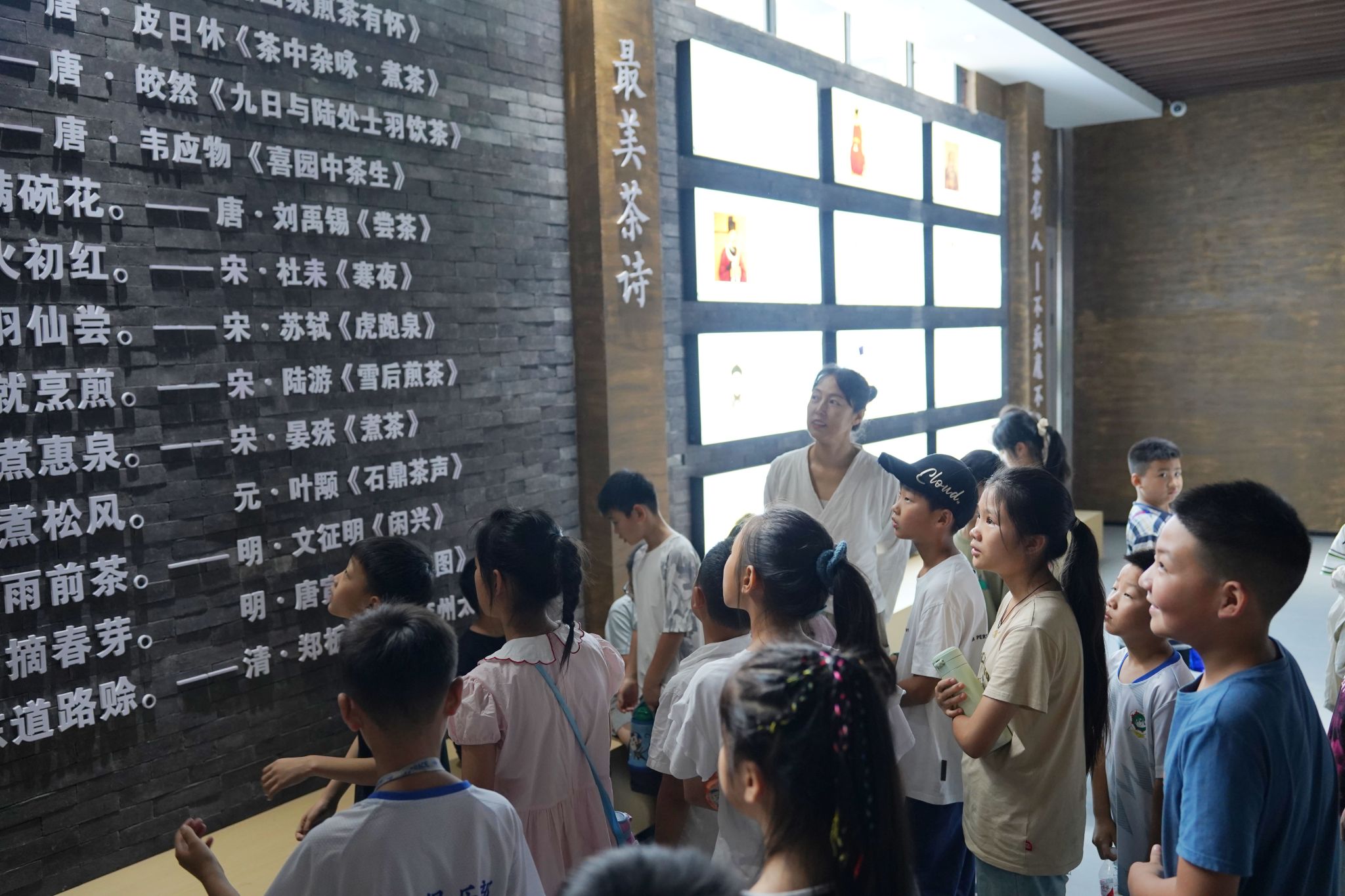 参观过程中,在博物馆工作人员的指导下,小先生有序带领小学员们进入茶室“涤烦”,学习茶艺中的坐姿,冥想静心,让小学员在潜移默化中领会“知茶习礼”、“与人为善,以礼待人”的处世之道,在忙碌的学习生活中找到了放松和愉悦的方式,丰富了暑期的课余生活。