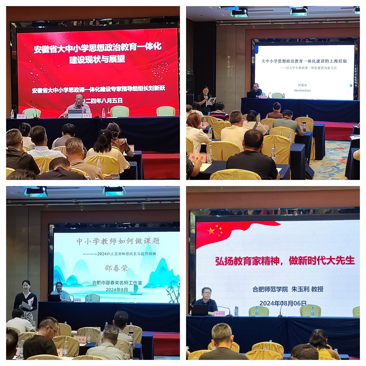 安徽省大中小学思政课一体化建设专家指导组组长刘新跃介绍了大中小学思想政治教育一体化建设的历史、安徽省建设现状与未来展望。合肥市名师工作室领衔人杨使兵结合自己的成长经历,强调了教研赋能教师专业化发展的重要性。合肥市第四中学政治学科主任周静从理论和实践两个角度诠释了思政课“同题异构”教学设计。上海师范大学马克思主义学院思政教师教育教研室主任刘建良给大家带来了大中小学思政教育一体化建设的上海实践经验。合肥市梦园小学教育集团校长邵春荣结合自身经历介绍了中小学教师如何做好课题研究。庐江县教育体育局教研员陶佳总结了庐江县近几年来在中小学思政课一体化建设的生动实践经验,强调要坚持系统思维来指导庐江县的继续探索工作。我校马克思主义学院朱玉利和傅文茹两位专家,分别围绕弘扬“教育家精神”与合肥市一体化建设成果做了专题报告,并得到参训学员的好评。