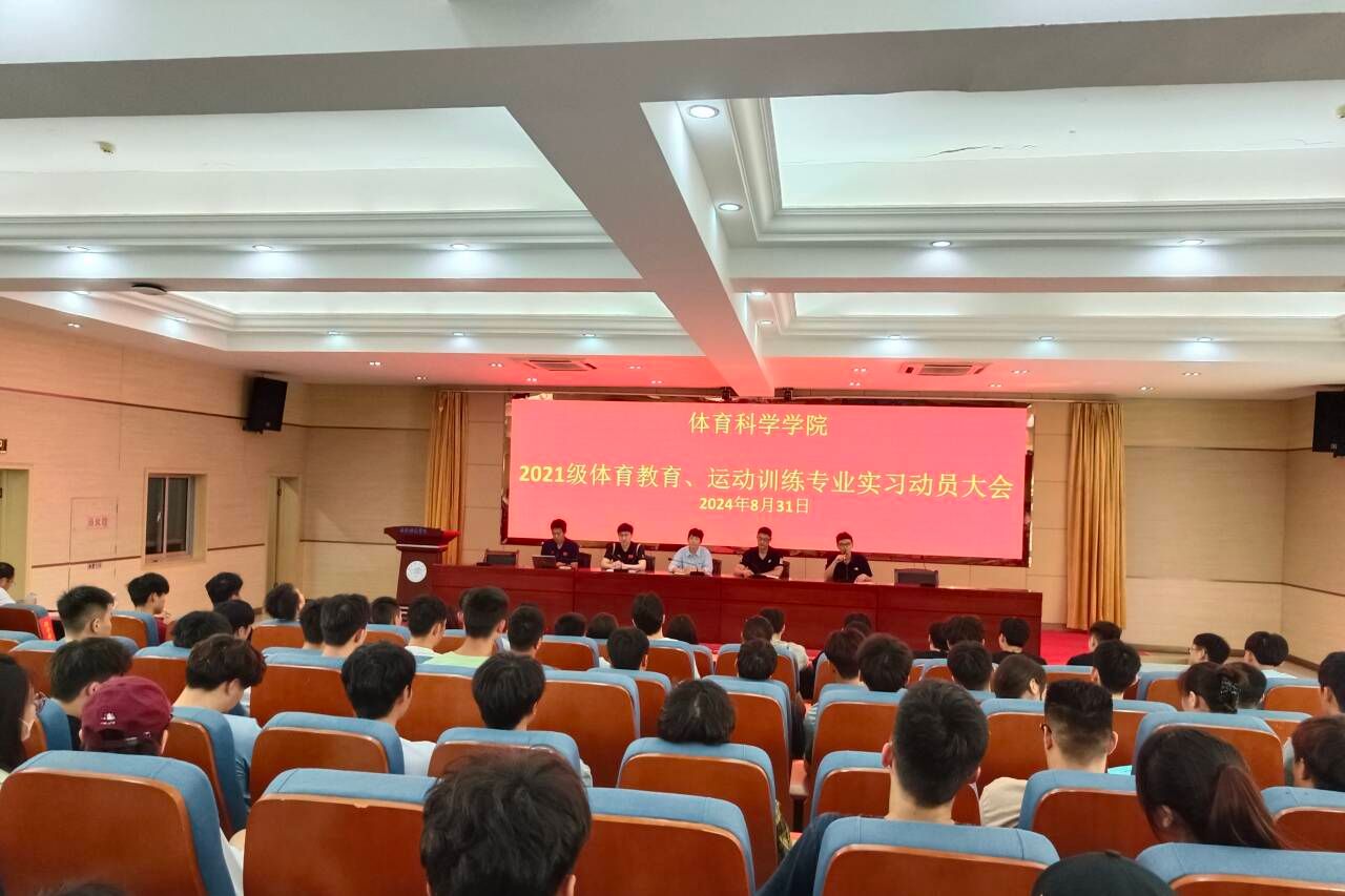 为组织落实好2021级体育教育专业、运动训练专业实习工作,切实加强教育实习管理,确保学生实习期间安全稳定,8月31日上午,体育科学学院在锦绣校区报告厅召开2024-2025学年第一学期实习动员会。体育科学学院副院长席莉、体育教育系主任曹垚、运动训练系主任游永豪、2021级辅导员陈山山、参加顶岗实习的全体实习生及体育教育系与运动训练系指导老师参加本次实习动员会,会议由体育教育系主任曹垚主持。