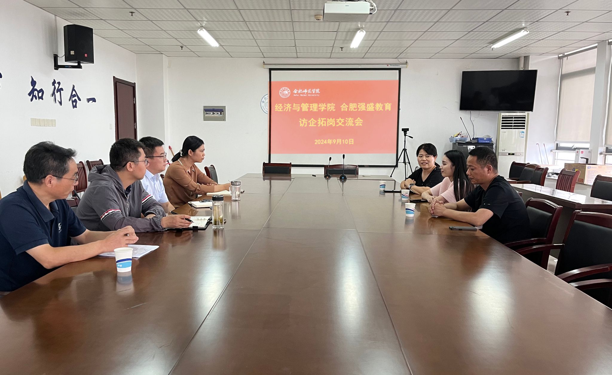 陈好代表经管学院对合肥强盛教育投资有限公司总监王艳云一行三人来院座谈交流表示热烈欢迎,简要介绍了学院的历史沿革、学生规模、师资力量、办学成效等总体情况,并表示希望以此为契机,进一步加强彼此的沟通联系,搭建常态化交流平台,助力打通学生从校园走向社会“最后一公里”,为企业输送更多优秀毕业生。王艳云介绍了公司的发展情况、用人需求、薪资待遇等,并就学生实习实训、就业创业等方面开展了交流探讨。