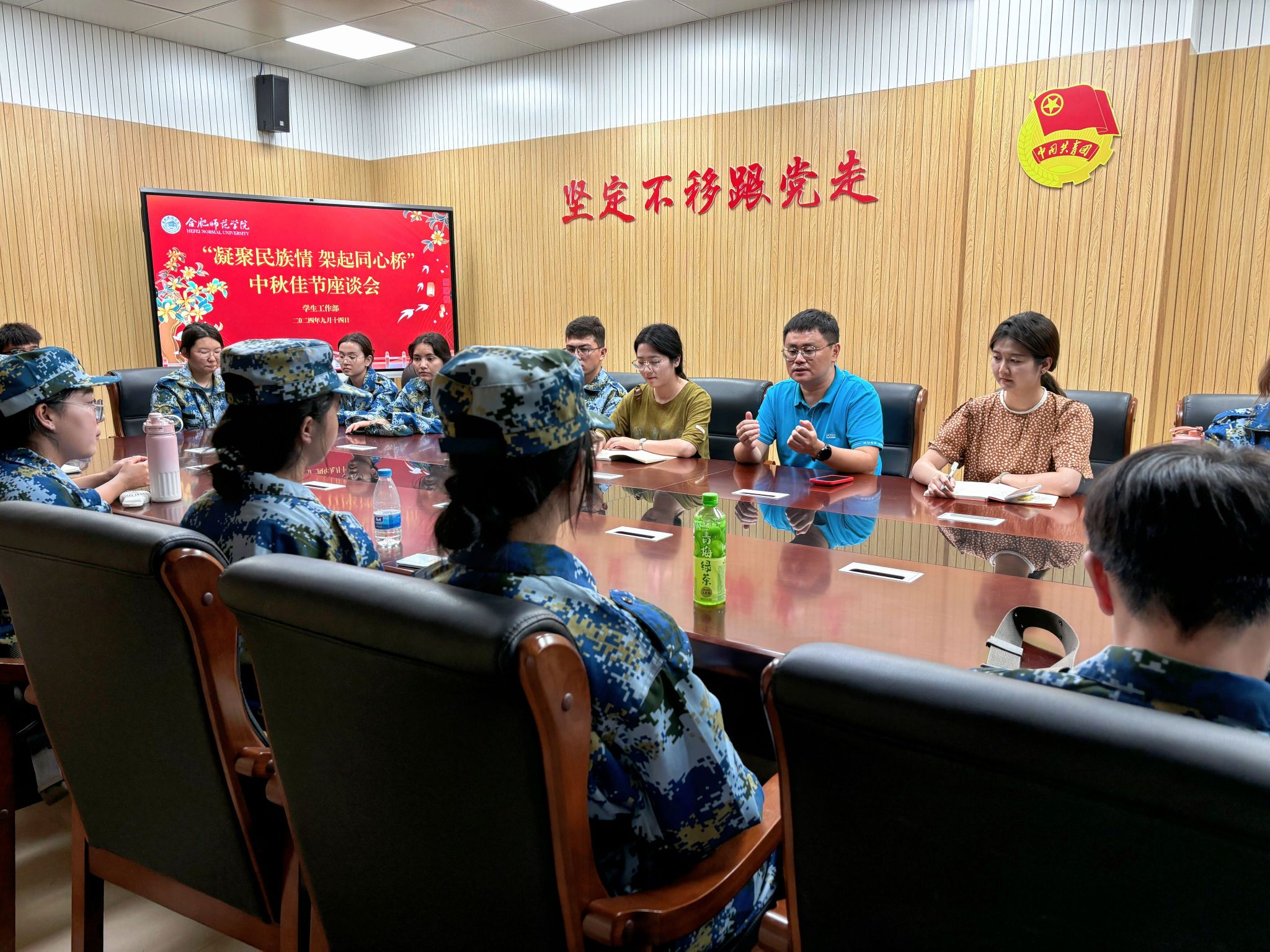 民族团结花盛开,石榴硕果满校园。9月14日中午,“凝聚民族情 架起同心桥”中秋佳节座谈会在锦绣校区共青之家举行。学生工作部部长、团委书记刁文彬及各相关二级学院辅导员代表、锦绣校区新疆籍新生参加会议。