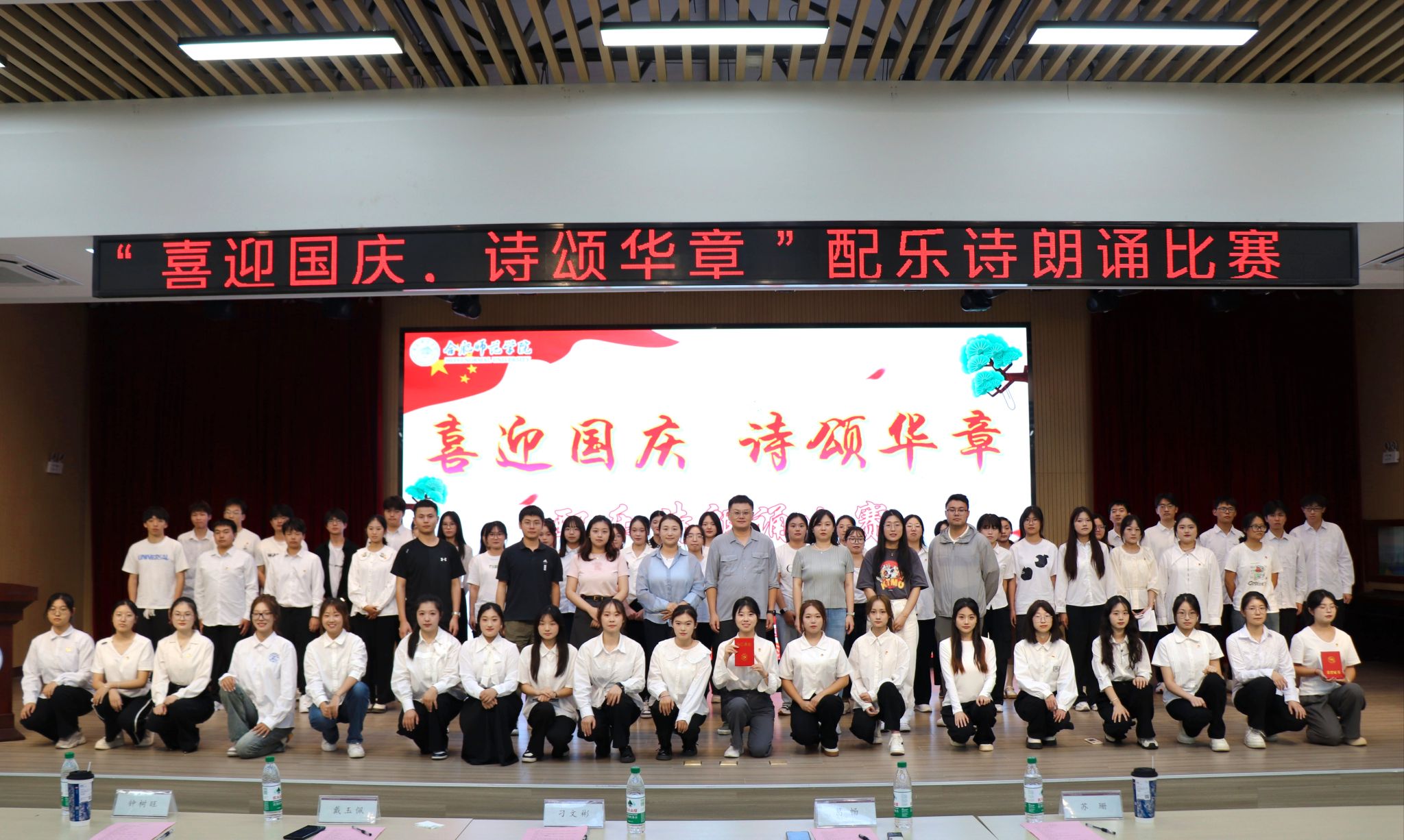 为庆祝中华人民共和国成立75周年,弘扬爱国主义精神,展现新时代青年风采,9月29日下午,第四期大学生青春学习营在锦绣校区大学生活动中心举办“喜迎国庆,诗颂华章”配乐诗朗诵比赛。青春学习营10个小组学员参加比赛,学生工作部、宣传部、就业创业工作处、院团委等单位负责人和教师担任评委,200余名学生到场观看。