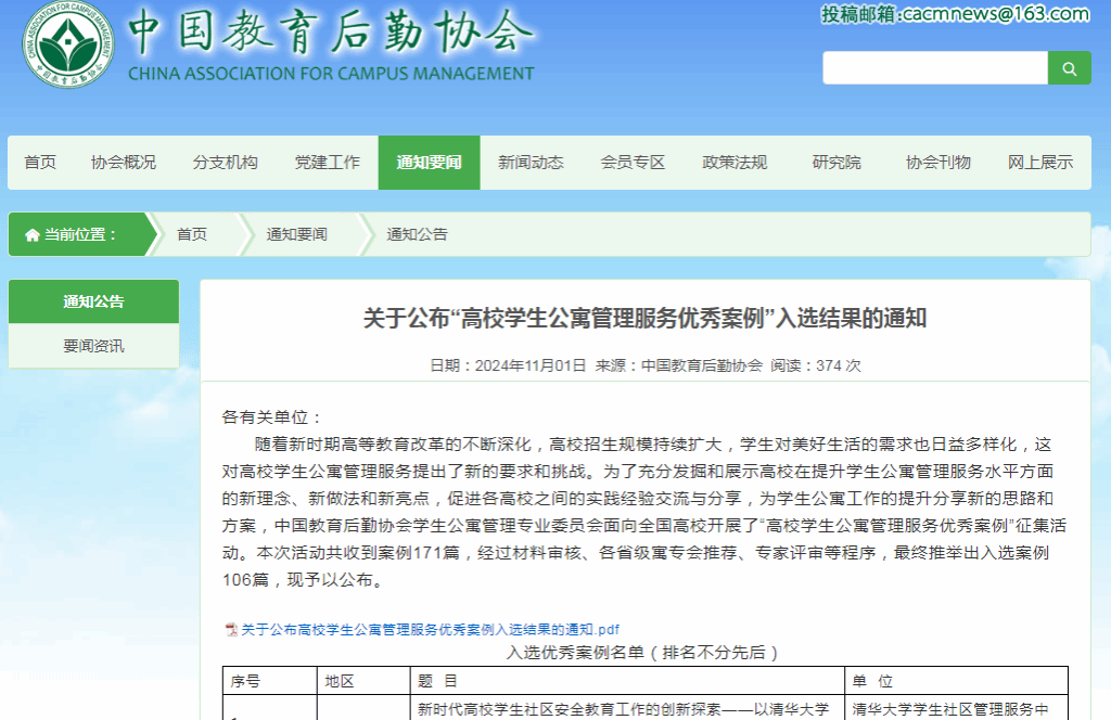 近日,中国教育后勤协会学生公寓管理专业委员会面向全国高校开展了“高校学生公寓管理服务优秀案例”征集活动,我院《beat365唯一官方网站学生公寓管理与服务的实践体会》工作案例成功入选。