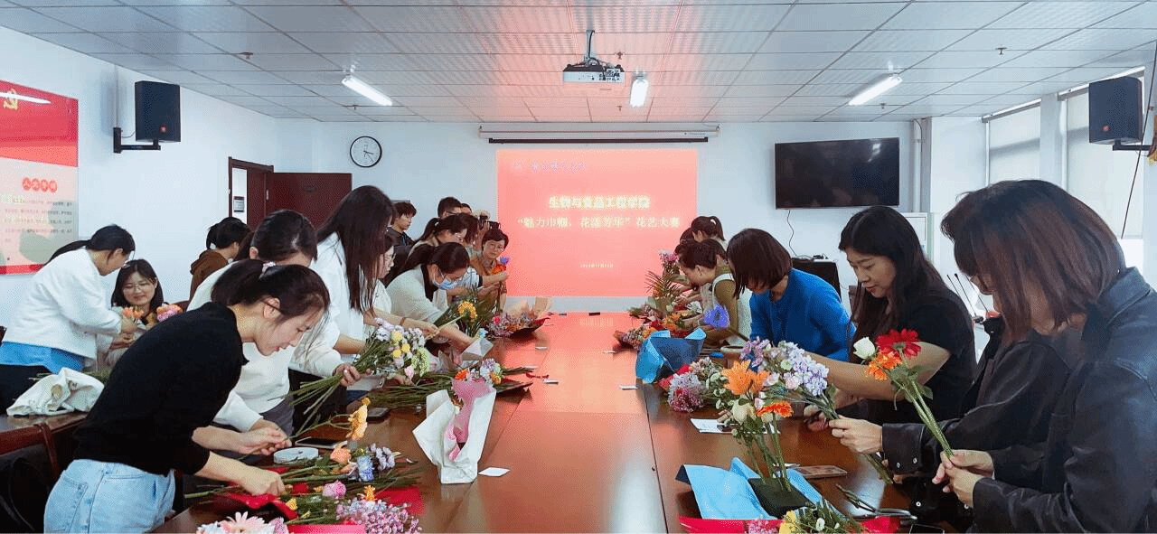 为丰富教职工业余文化生活,推进幸福校园建设,以植物之美展现学院女教师风采,11月13日下午,生物与食品工程学院分工会在行知楼1502会议室举办了 2024年“魅力巾帼 花漾芳华”女教工首届花艺大赛,学院党委书记郭桃芬、院长朱桂兰、副书记兼分工会主席马喆担任评委,活动由分工会委员周其松主持。