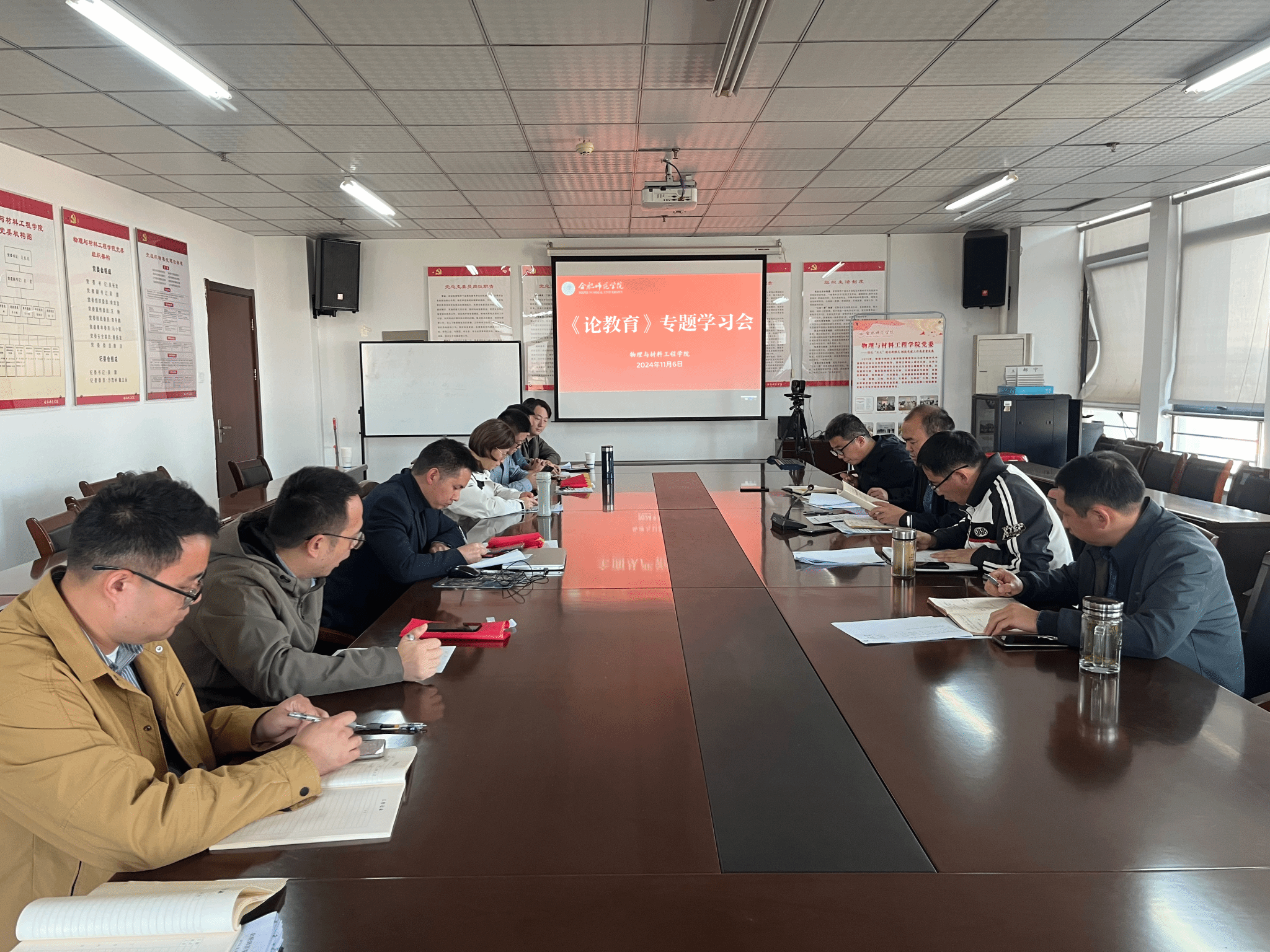 11月6日下午,物理与材料工程学院党委中心组在行知楼1202会议室专题学习《论教育》。院党委委员、教工党支部书记、学生党支部书记参加会议,院党委书记吴长龙主持学习会。