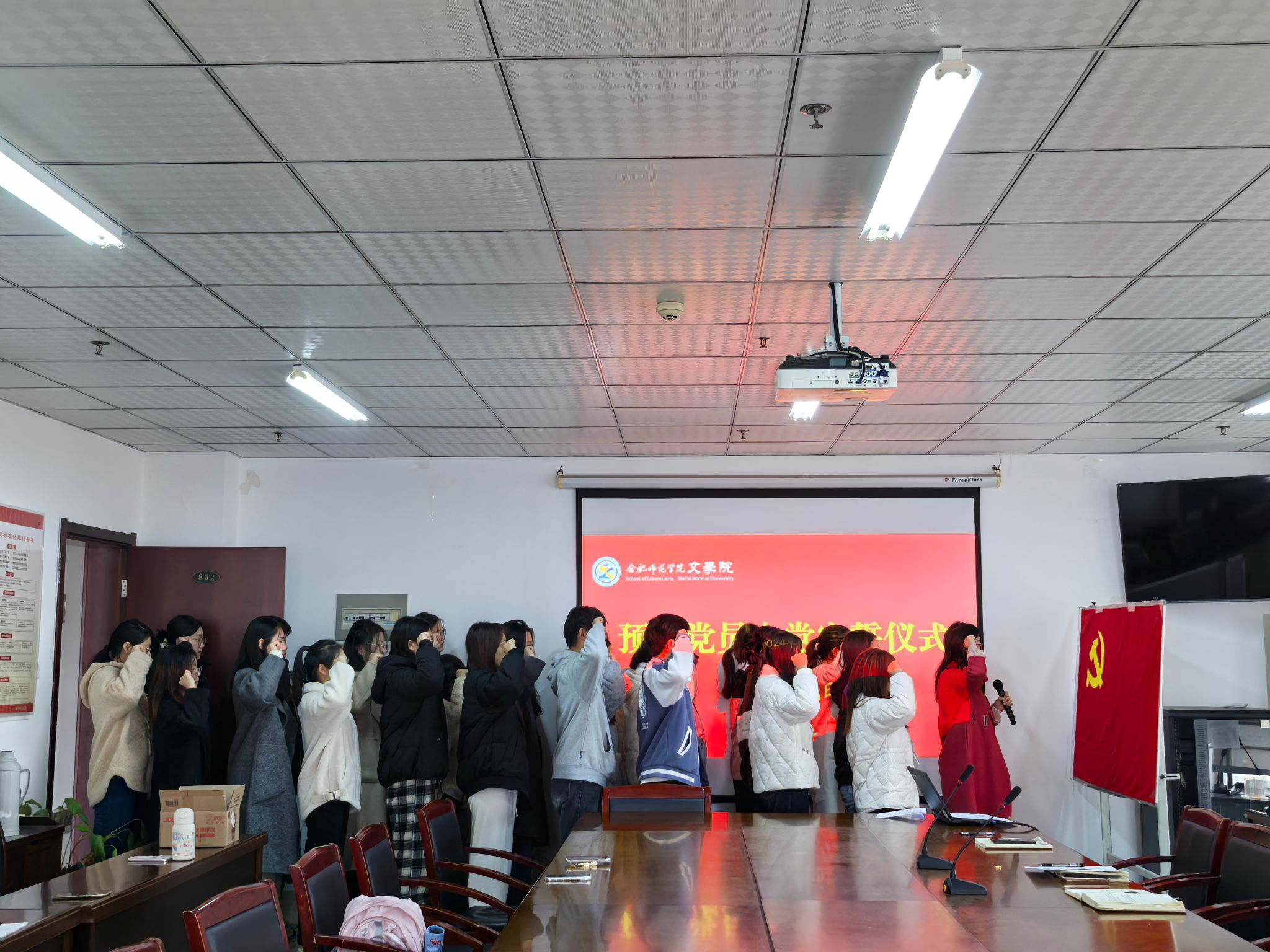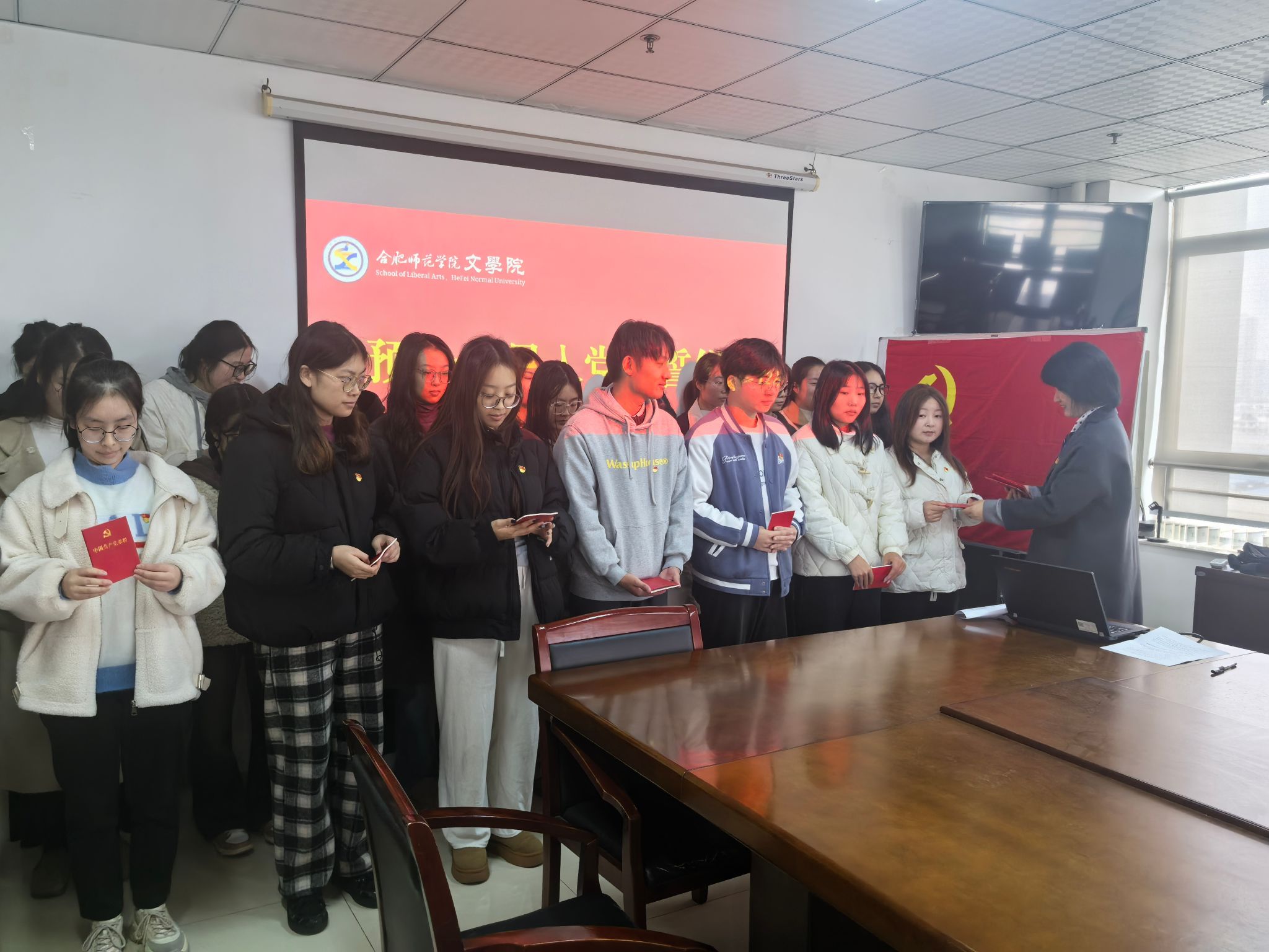 为了进一步增强新党员入党荣誉感,12月5日,文学院在行知楼802室举行2024年下半年新党员入党宣誓仪式。学院党委书记许锃、党委副书记夏娟、学生第二党支部书记曹甜甜,25名新党员参加此次宣誓仪式。宣誓仪式由组织员疏淑进主持。