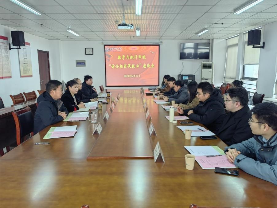 为了加强学院与用人单位的联系,拓宽学生就业渠道,全力推动毕业生实现更充分、更高质量的就业,12月27日,安徽省凤台县精忠中学、上海新南洋昂立教育科技股份有限公司、合肥北辰教育培训学校有限公司、安徽百得思维信息科技有限公司和安徽飞数信息科技有限公司等用人单位应数学与统计学院邀请,在行知楼1102会议室举办“访企拓岗促就业”座谈会。学院党委书记穆娟、院长杨刘、党委副书记陶金昌、副院长黄浩、辅导员曾飞参加会议。会议由穆娟主持。