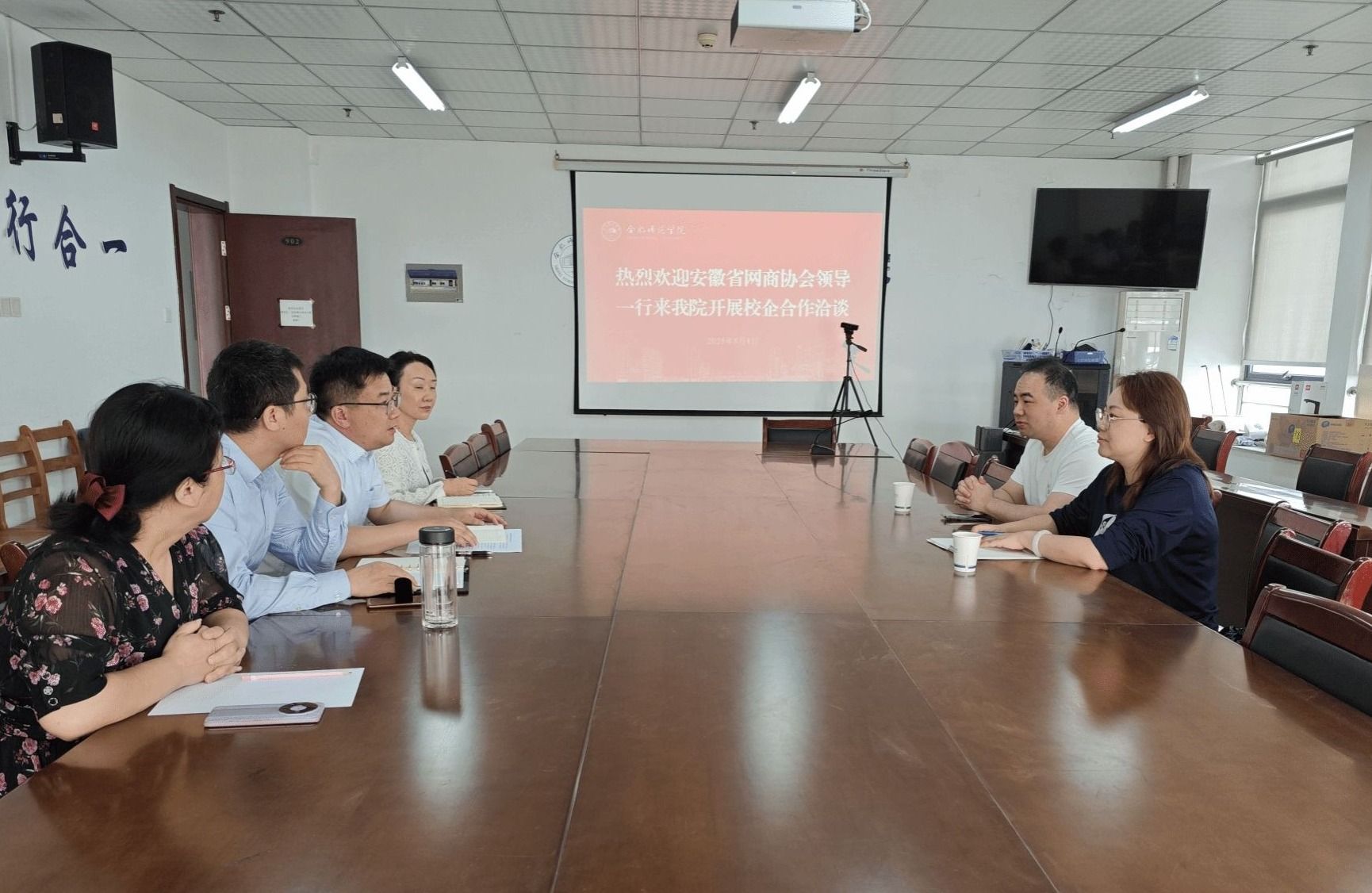 为响应数字经济时代人才需求,5月7日,经济与管理学院与安徽省网商协会校企合作交流会在经济与管理学院会议室举行。安徽省网商协会执行秘书长丁乐娴、合肥火橙电子商务有限公司总经理徐许一行到访,经管学院党委书记陈好、党委副书记陶敏、副院长钟玉文以及国贸系负责人郭云等与协会领导围绕电商人才培养、产学研协同创新展开深度对话,共绘校企合作新蓝图。
