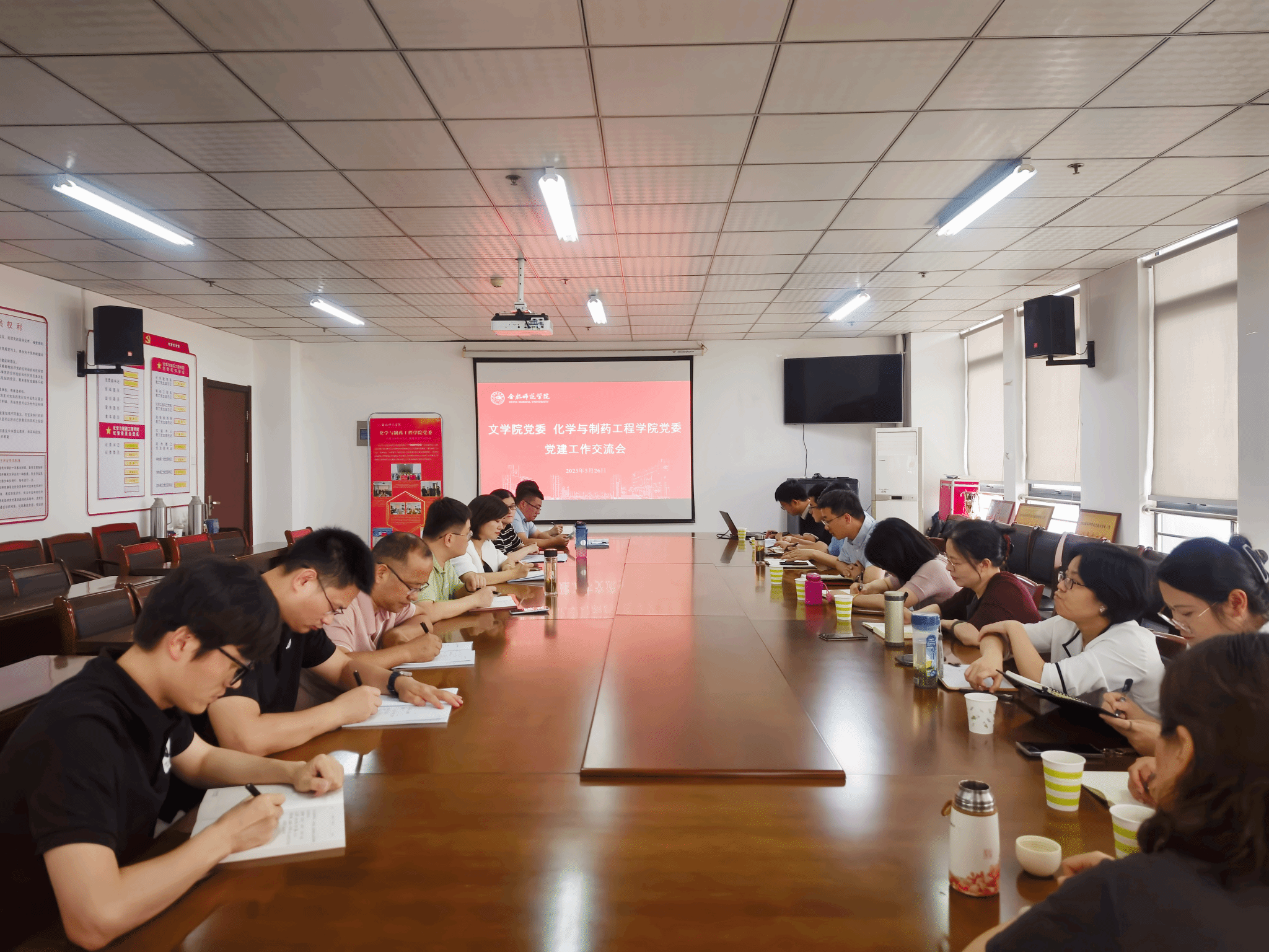 为进一步提升学院党建工作标准化规范化水平,学习兄弟学院“双创”工作成功经验,5月26日下午,文学院党委书记许锃、党委副书记夏娟带领学院党支部书记、支委委员和党委秘书等,赴化学与制药工程学院学习交流党建工作。化学与制药工程学院党委书记刁文彬、党委副书记朱晓熠,师生党支部书记、组织员全程参与交流。