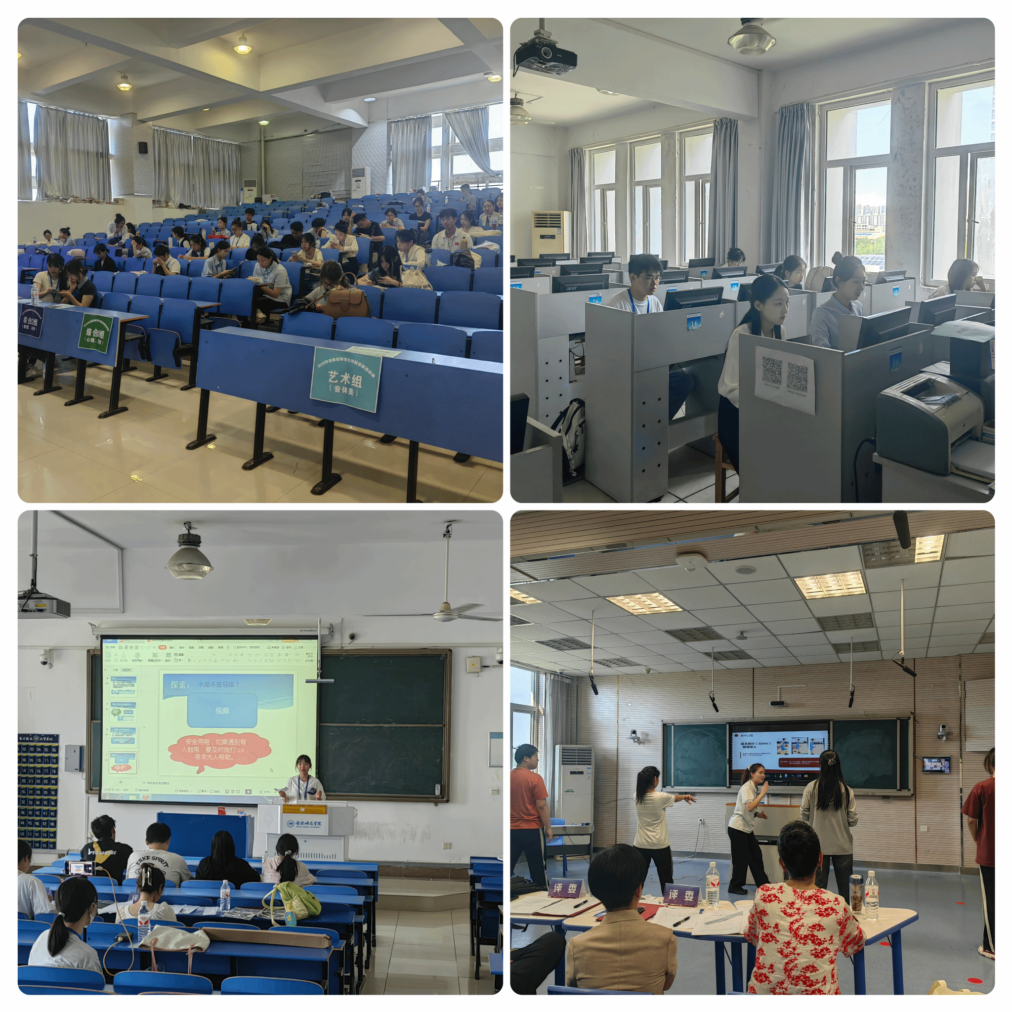 在教学竞赛中共有来自文学院、外国语学院、数学与统计学院、马克思主义学院、教育与心理科学学院、化学与制药工程学院、物理与材料工程学院、生物与食品工程学院、音乐学院、美术与设计学院、体育科学学院等11个二级学院的84名选手参加。参照省赛的竞赛模式,比赛设中学组(按照学科划分,设语文、数学、英语、思想政治、物理、化学、生物7个竞赛组)、小学组(按照学科划分,设语文、数学、英语、科学、道德与法治5个竞赛组)和综合组(设音乐、体育、美术、心理健康4个竞赛组)和学前组,共计17个组别,采用“一站式”的竞赛方式,选手通过模拟上课、即席讲演、课件制作等多个竞赛项目进行比拼。