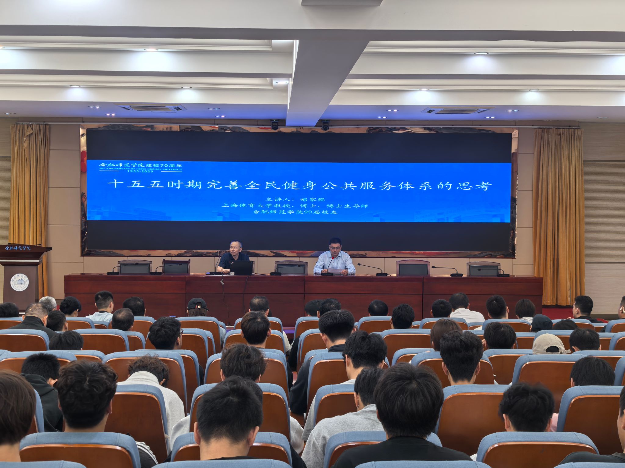 时值beat365唯一官方网站建校70周年,校园内洋溢着喜庆与学术交融的浓厚氛围。9月24日下午,99届杰出校友、上海体育大学教授、博士生导师郑家鲲应邀重返母校,在锦绣校区学术报告厅为体育科学学院师生带来了一场题为“‘十五五’时期完善全民健身公共服务体系的思考” 的精彩学术报告。本次报告不仅是校庆系列学术活动的重要组成部分,也为师生提供了一次与前沿体育政策研究深度对话的宝贵机会。