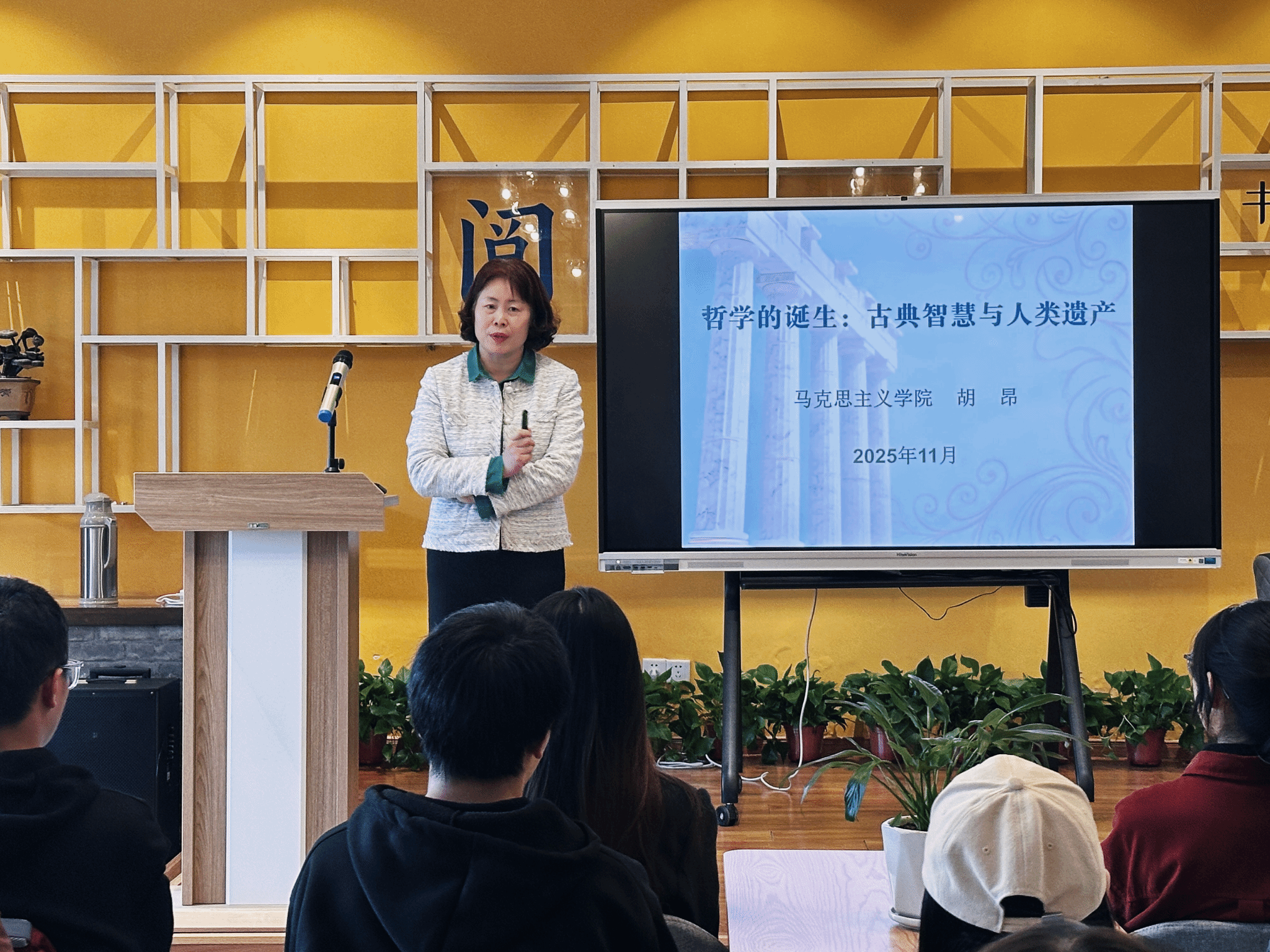 11月12日,锦绣校区“阅+历”读书讲堂“人文十讲”第五讲由安徽省政协委员、中国历史唯物主义学会会员、我校科研处处长胡昂教授以“哲学的诞生:古典智慧与人类遗产” 为题开展专题讲座,带领同学们回溯古希腊哲学的辉煌历程,探寻其跨越千年的思想魅力与现实启示。本次讲座由教务处处长钱立青教授主持。