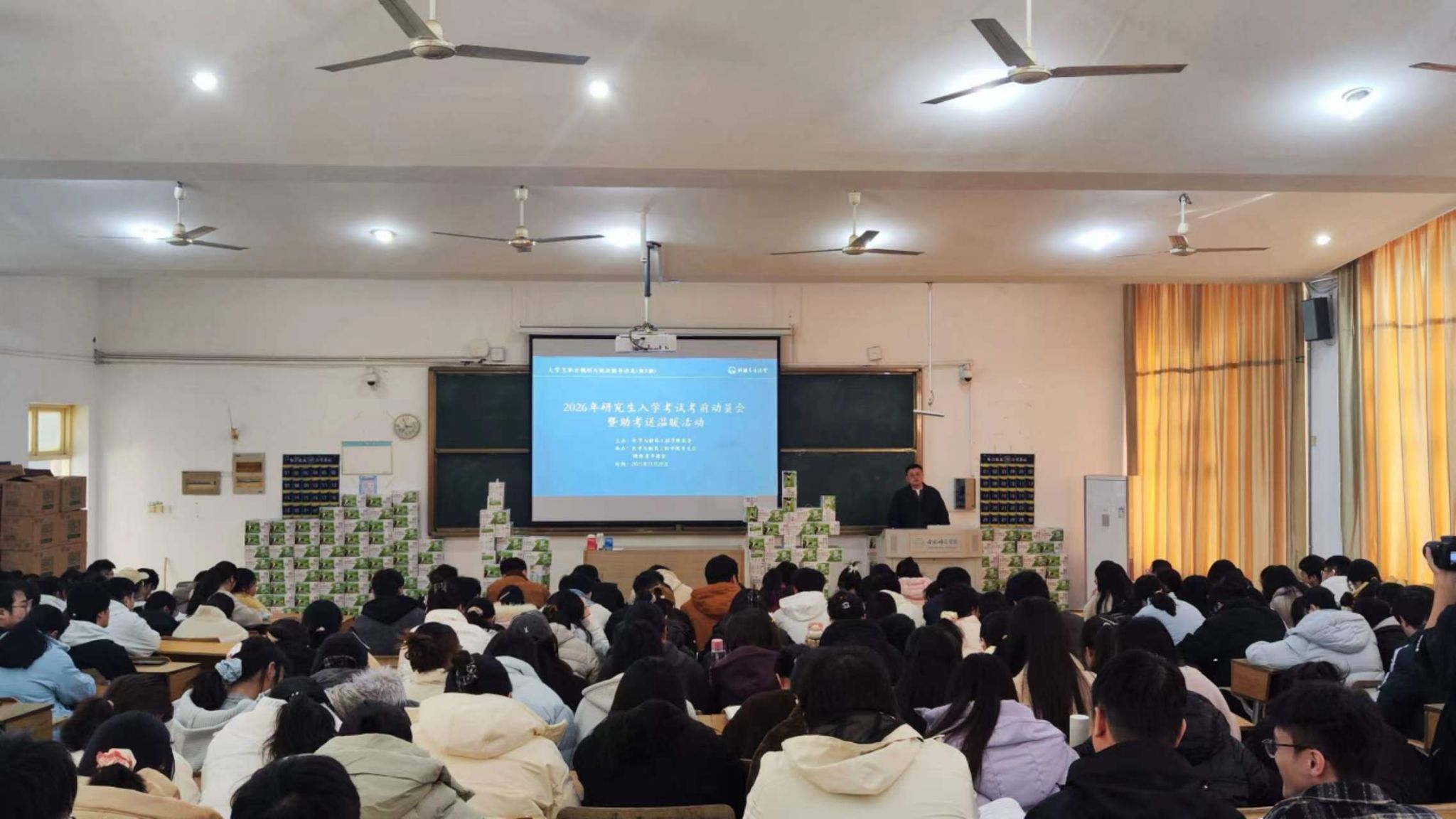各毕业班辅导员结合自身经验和所带学生的具体情况,进行了细致入微的考前指导。他们从考前作息调整、答题技巧、考场心态、物品准备等多个方面给予了实用建议,叮嘱同学们在最后冲刺阶段要回归基础、保持手感,更要相信自己长期以来的努力与积累。辅导员们语重心长的叮嘱和关怀,让在场学子倍感温暖与鼓舞。动员环节结束后,活动现场进入了温馨的“送温暖”环节。学院领导与老师们一同将精心准备的“助考加油包”——代表健康与关怀的暖心牛奶,送到每一位考研学子手中。一盒盒牛奶,承载的是学院对学子们身体健康的关切,更是“一杯奶,一份情,一股劲”的深切寓意,希望同学们补充营养,精力充沛地完成最后的冲刺。