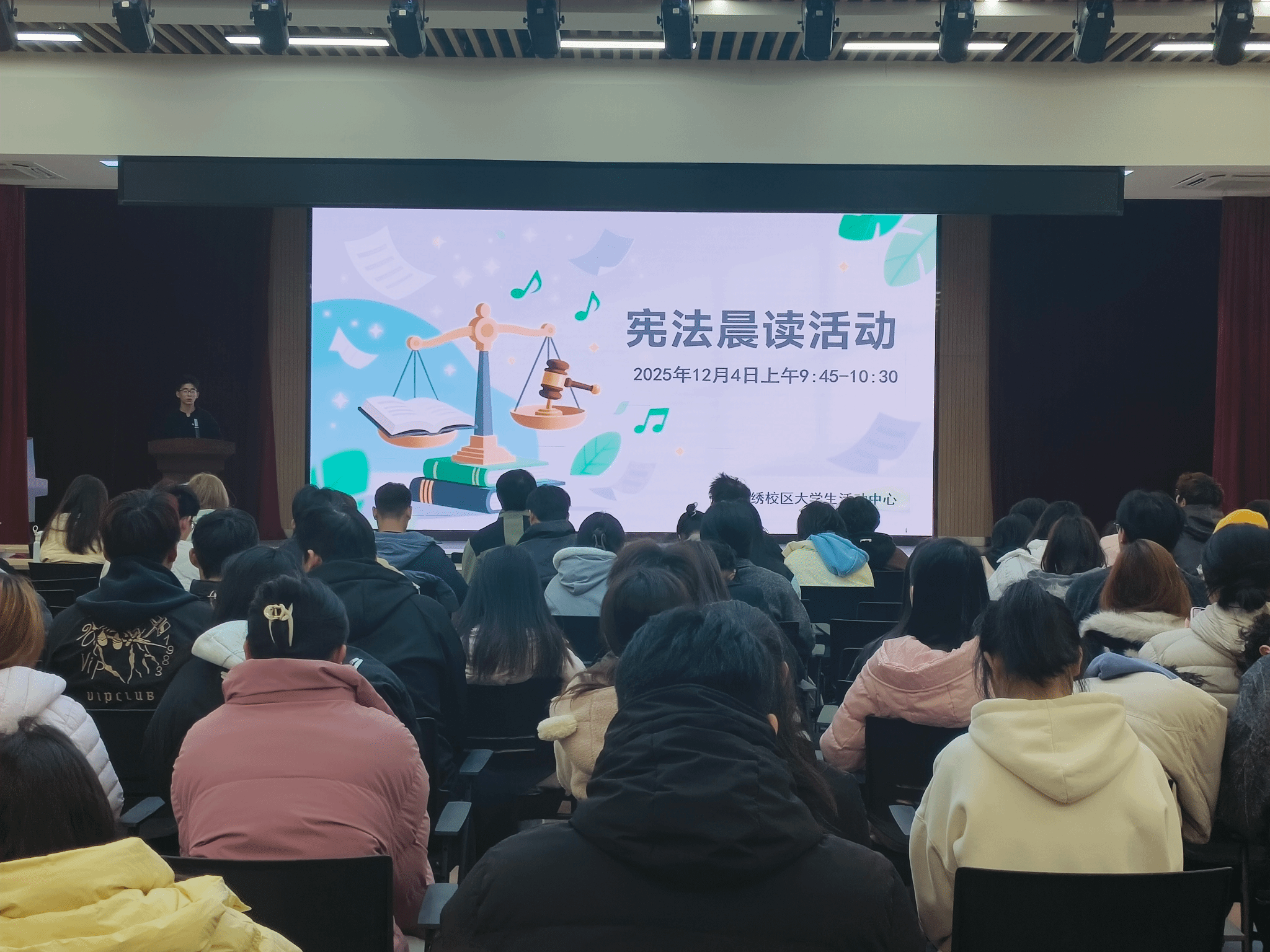 12月4日是第十二个国家宪法日,为深化宪法精神教育,弘扬宪法精神,院学生会于12月4日在锦绣校区大学生活动中心举办了“宪法晨读”活动,200余名同学参与。