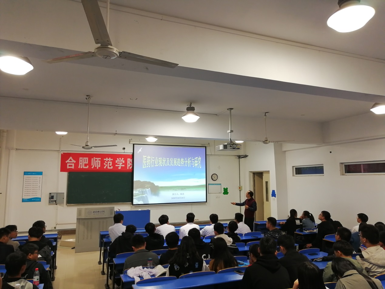 本网讯 10月28日下午,“行知讲堂”学术报告在锦绣校区逸夫楼A209教室举行。本场报告由化学与化学工程学院陈虎副教授主讲,主题为“医药行业现状及发展趋势分析与研究”,药物制剂专业学生聆听了学术报告,报告由药物制剂系赵明老师主持。
