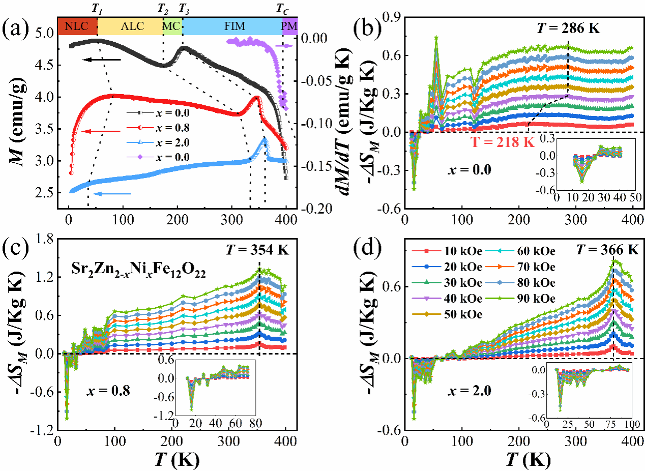 近日,由我校物理与材料工程学院与安徽大学联合培养的硕士研究生曹冰菲同学与物材学院本科生夏敬鑫、王璟雯组成的学生科研团队,针对Y型六角铁氧体的磁热效应与磁制冷性能开展研究并取得重大进展,相关成果发表在《Materials Today Physics》(中科院一区,IF = 10.0),论文题目为“Inverse and conventional dual magnetocaloric effects in Ni substituted Y-type Sr2Zn2-xNixFe12O22 hexaferrites”。曹冰菲同学为本论文的第一作者,物理与材料工程学院新能源材料与器件专业的吴耀东、訾振发老师为本论文的共同通讯作者,beat365唯一官方网站物理与材料工程学院为唯一通讯单位。