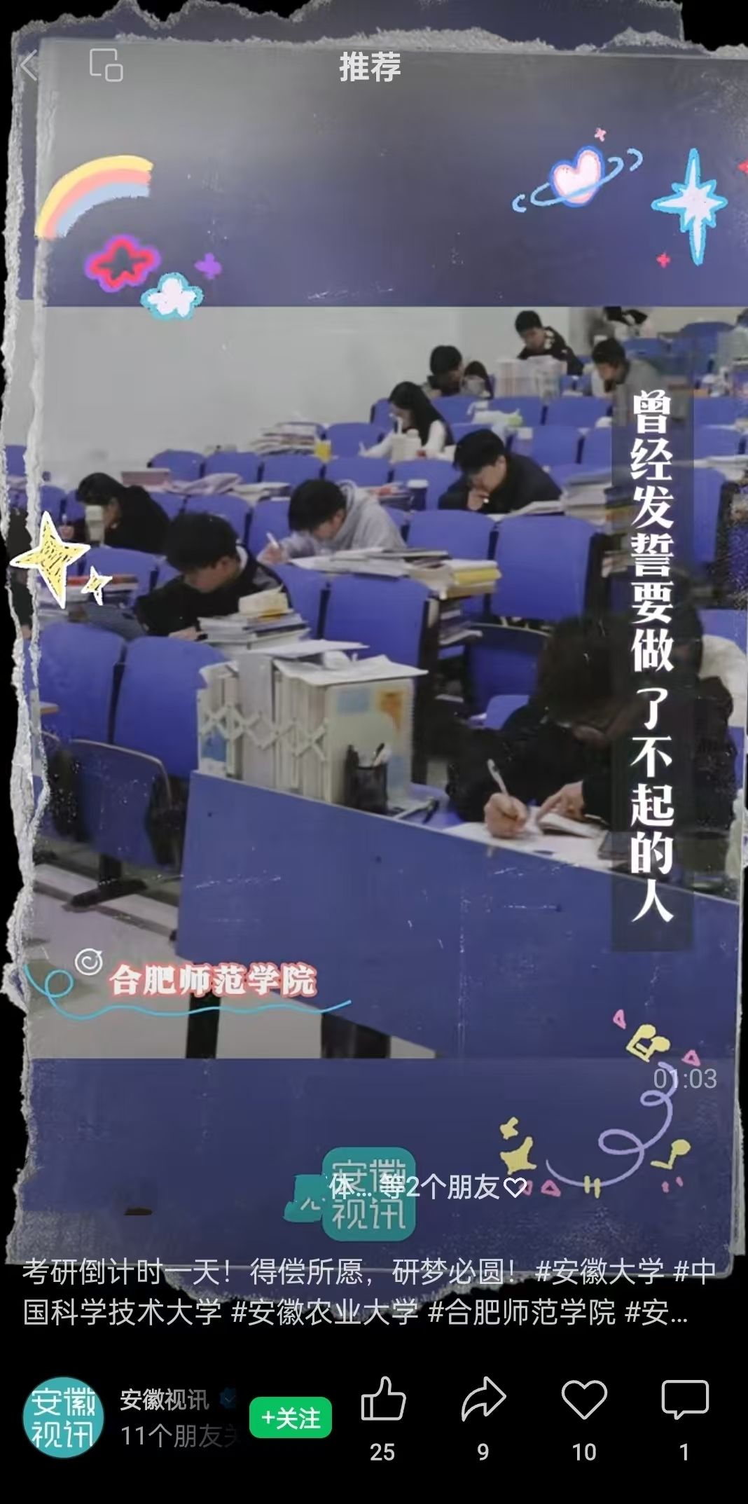 12月20日,安徽视讯视频号发布我校学子考研主题宣传视频,为合师考研学子加油助力。(宣传部)
