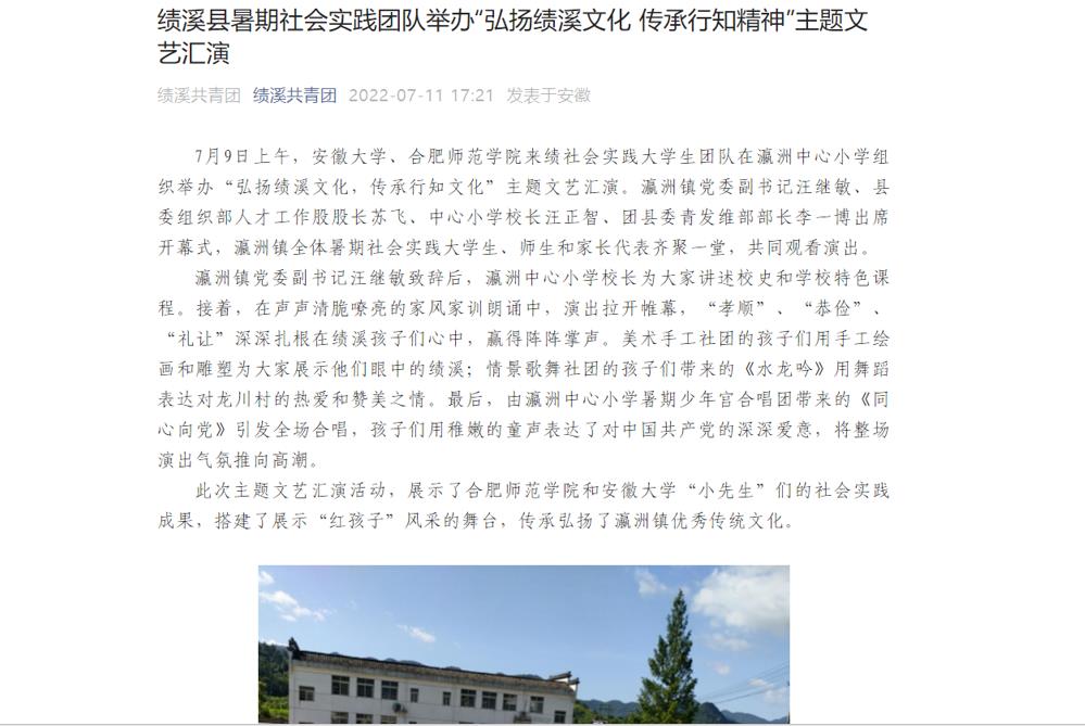 近日,院团委绩溪行知学堂先后受到中国青年网、安徽日报客户端、团绩溪县委微信公众号等多家媒体报道。