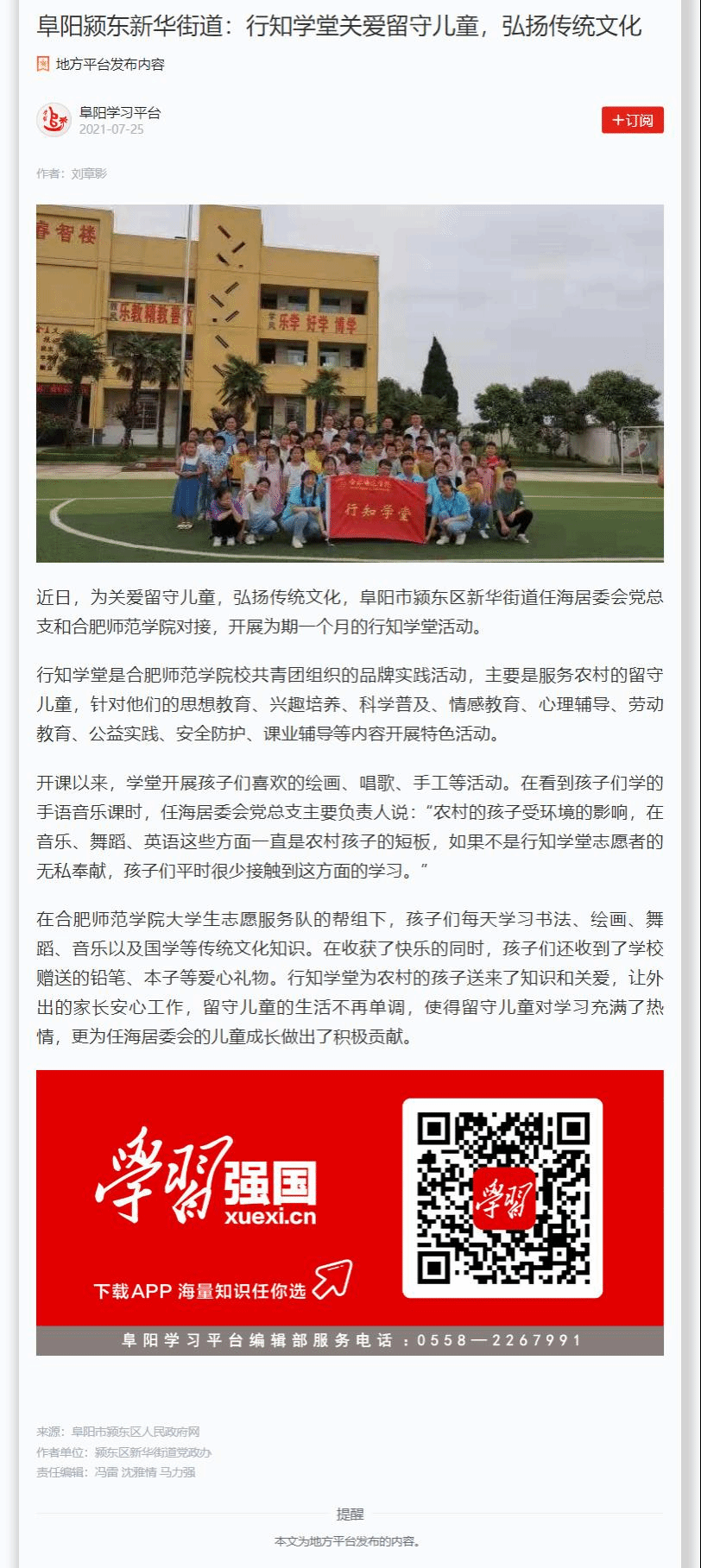 本网讯 7月12日,数学与统计学院新华行知学堂在阜阳市颍东区新华街道任海小学顺利开班。据悉,该学堂为期20天,该学堂的小先生团队由来自我校数学与统计学院和安徽医科大学共10名学生组成,课程内容包括党史学习教育、体育教育、行知文化、心理健康教育等课程。